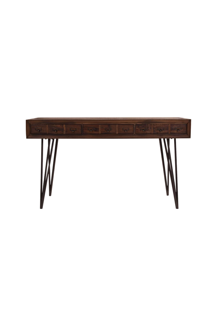 The Chem 3 Drawer Desk features reclaimed timber with metal legs. While maintaining the design of small apothecary drawers, each drawer functions to modern day size with 3 handles wide. It is a natural product, so some colour variation can occur. Part of our AFT industrial range.