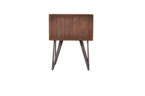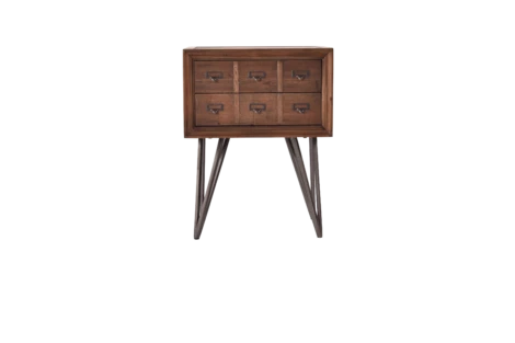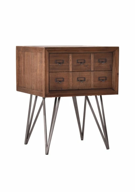 The new Chem range of occasional furniture has finally arrived! Made from recycled timber and the influence of small apothecary drawers, each drawer functions to modern day size. This side table has two drawers. Part of our AFT industrial range. Finish: Recycled Fir with aged metal legs and handles.