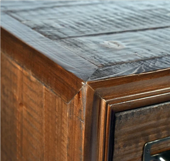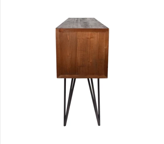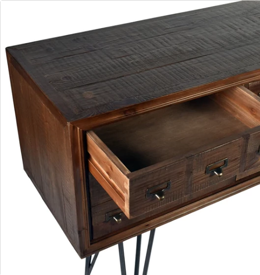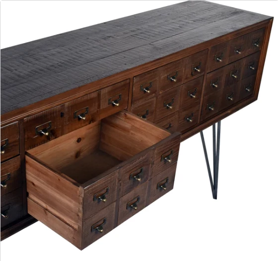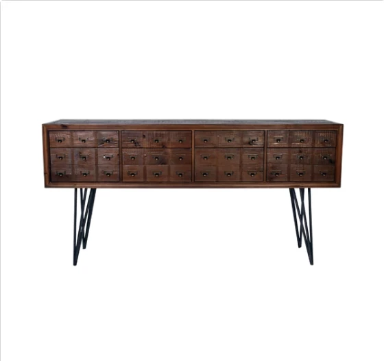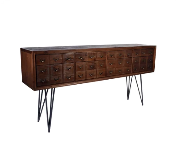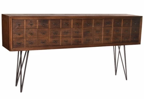 The new Chem range of occasional furniture has finally arrived! Made from recycled timber and the influence of small apothecary drawers, each drawer functions to modern day size. This sideboard has eight drawers. Part of our AFT industrial range. Finish: Recycled Fir with aged metal legs and handles.