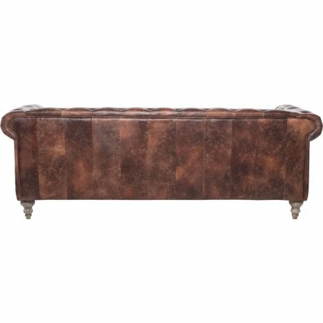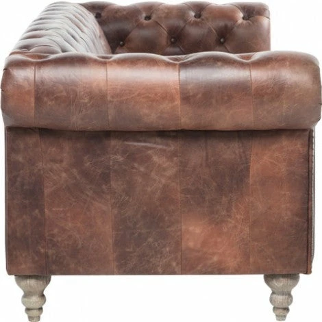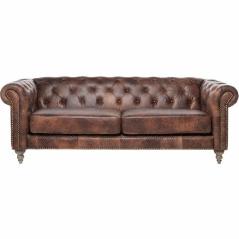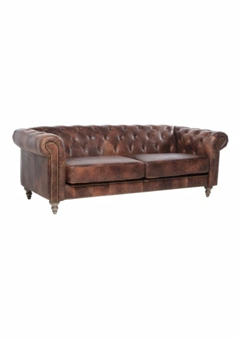 Spacious 3 seater sofa upholstered in genuine, waxed leather and brass studs for ultimate luxe factor. Bulbously shaped cherry wood legs add to the vintage classic style of the Chesterfield design. Sit back and enjoy the soft leather feel of this charming sofa.