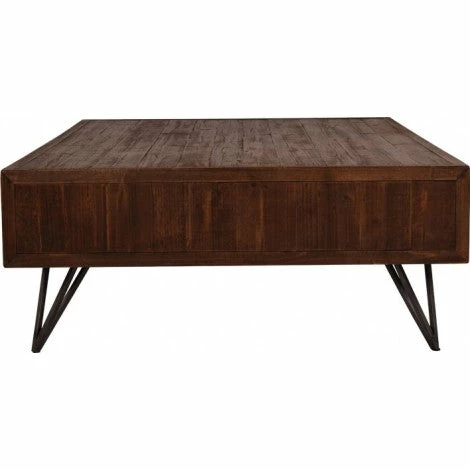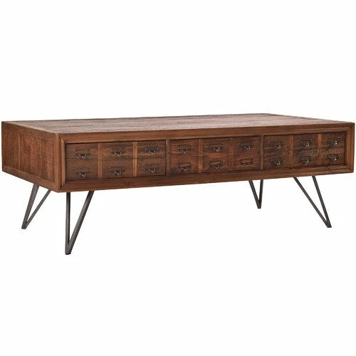 Coffee table featuring recycled fir wood and aged metal legs. While maintaining the design of small apothecary drawers, each drawer functions to modern day size with 3 handles wide and 1 – 2 handles high. The pull through feature takes the guess work out of the positioning of the drawers.