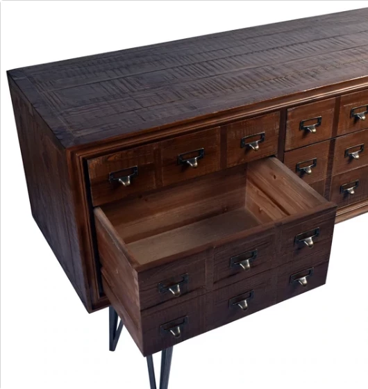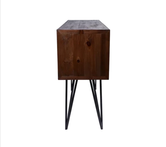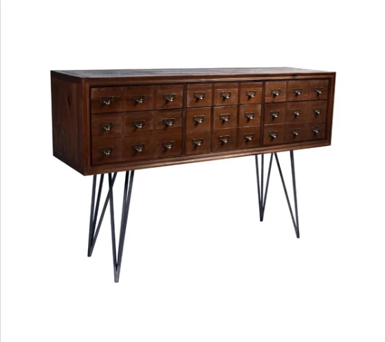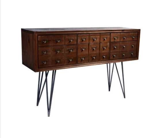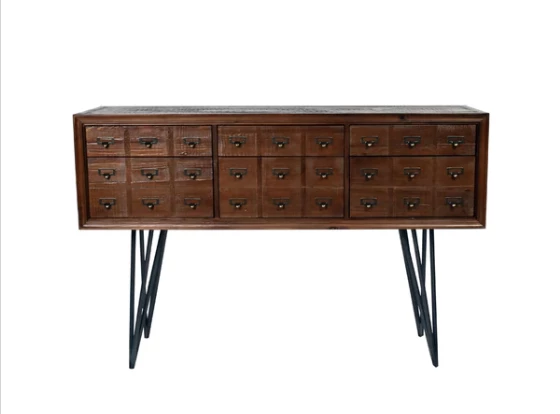 Made from recycled timber and the influence of small apothecary drawers, each drawer functions to modern day size. This console has six drawers. Finish: Recycled Fir with aged metal legs and handles.