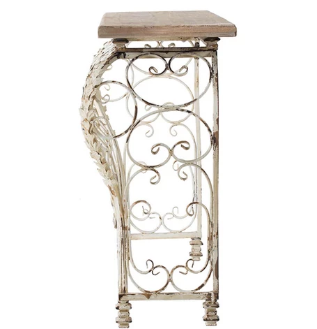 The curved base of this console table has intricate scrollwork that elevates its sleek and elegant style with a floral and leaf design. The metal base has an antique white finish that’s paired with a rectangular wood tabletop. The open design of the base and mixed materials of this console lend an easygoing, airy element that’s ideal for an entryway or foyer.