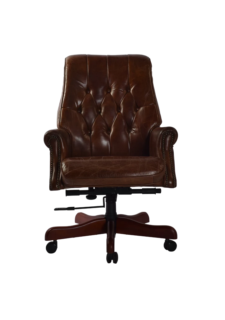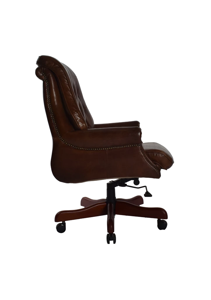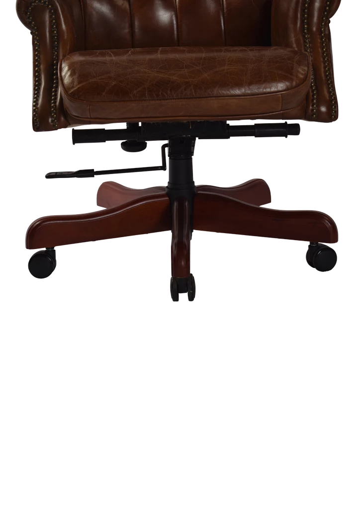 Fully functional gas lift chair in Vintage Cigar Aged Leather. Pleated studded back and wooden base on castors.