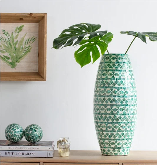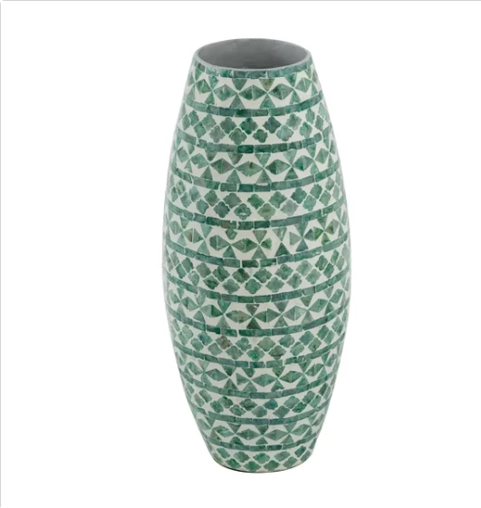 Tall and tempting, this green Capiz vase makes an exquisite bohemian accent for a living room, dining room or entryway. Geometric patterning and the Capiz inlay bring visual texture to the understated frame. The height gives this vase a graceful presence, making it a striking addition to any surface.