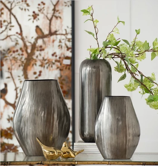 This decorative aluminum layered chisel oval vase in a smoke chisel finish is a striking choice for an entryway or dining table centerpiece. The tall vase shows off a vertical chisel design and a silver finish. Crafted from aluminum, the vase is complete with a metallic sheen.