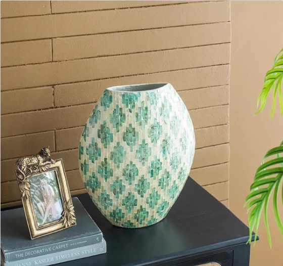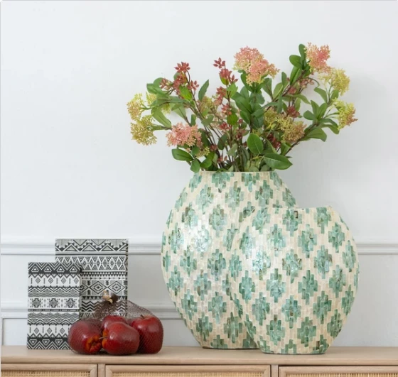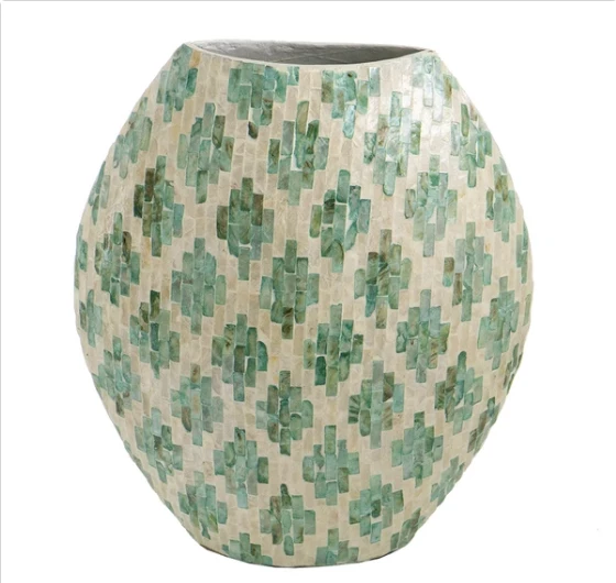 With a diamond pattern running along its sizable green and tan frame, this Capiz vase is an accent piece that can’t be missed. The oval shape and Capiz inlay amplify the vase’s bohemian style, and the size allows it to serve as a centerpiece on a table or mantle. An elegant design that complements its contents and surroundings, ideal for a living room or foyer.