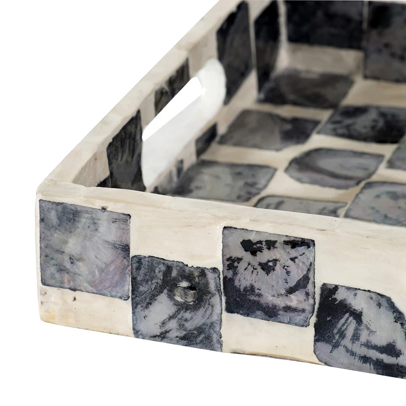 A small, decorative tray comes resplendent with a mosaic with pearl black and white tiles arranged in a checkered pattern. It comes with side handles on each side for easy carrying. Decorate a coffee table or side table with this illustrious tray and let it complement your decor with its whimsical style.