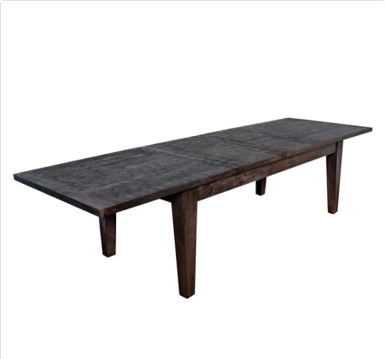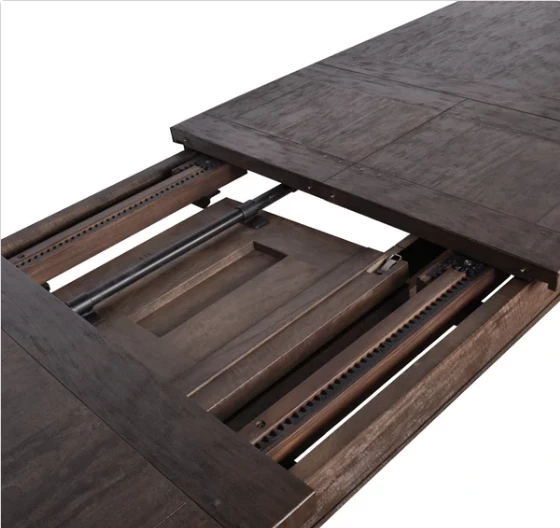 The double extension table design gives you the flexibility of using it in three different configurations. The table closed is 2.1m long, it then extends to 2.6m and then again to 3.1m. The extension system is effortless to use. Switching between lengths is fast and easy. Simply pop out the leaves and the table will move on its smooth metal rollers. This table is made from solid fruit wood timber. This type of wood is renowned for its beautiful texture and is made to last. Finished with a clear lacquer. The extension mechanism is made from durable steel.