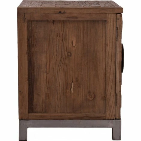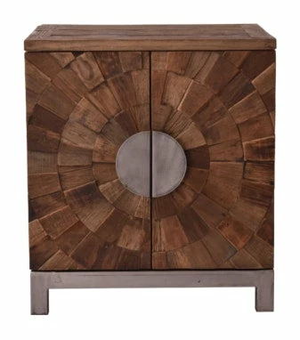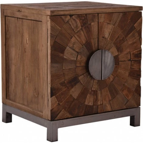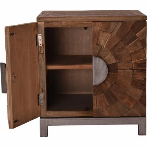 Recycled elm parquetry side cabinet with a silver iron frame and legs.