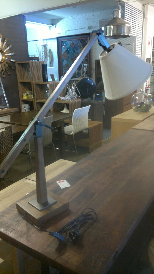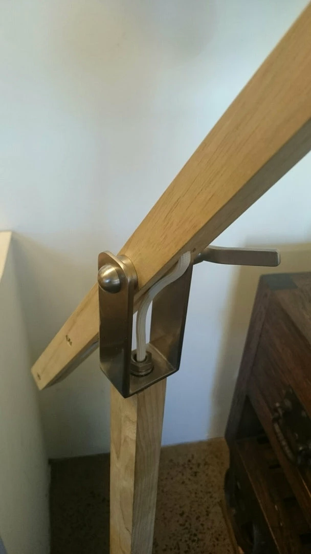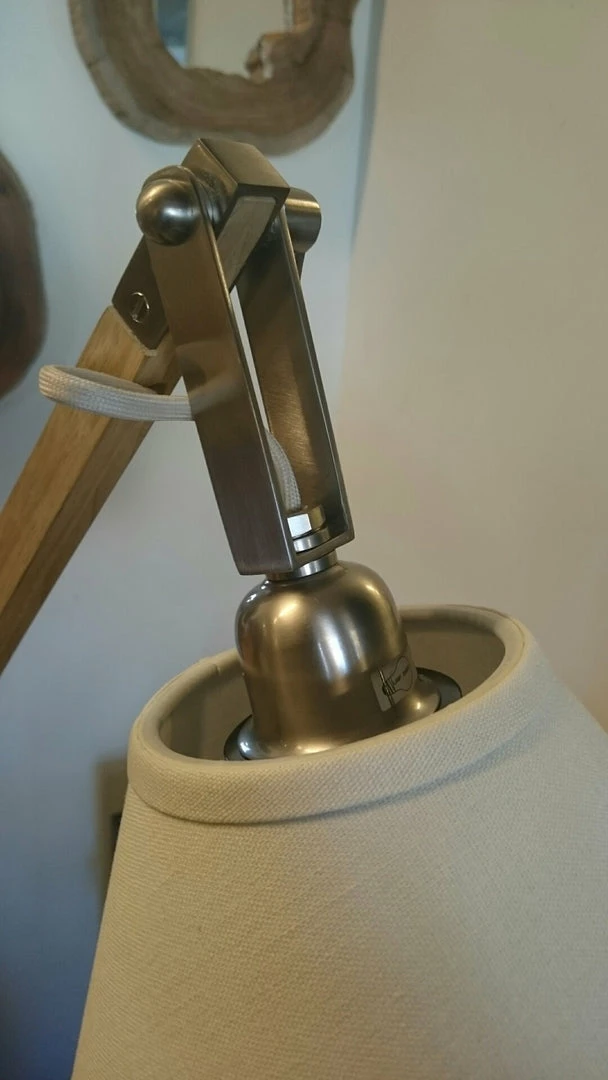 Adjustable centre arm and shade attachment. Available in Weathered Oak with Satin Nickel Plated Brass and Walnut and Brass inserts.