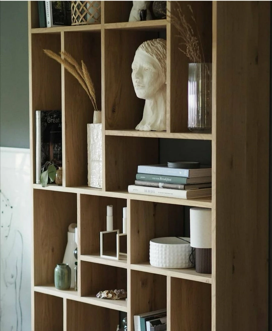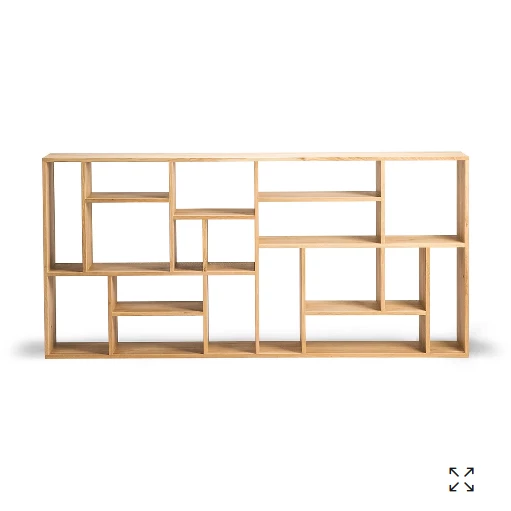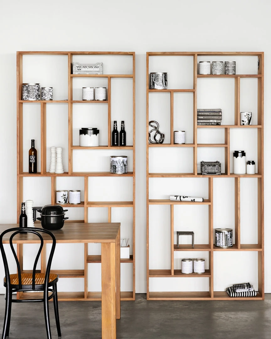 The Mondrian-inspired M-Rack is based on the Dutch painter’s famous grid of vertical and horizontal lines. This rack is available in two sizes in solid Oak and the larger size in Teak.