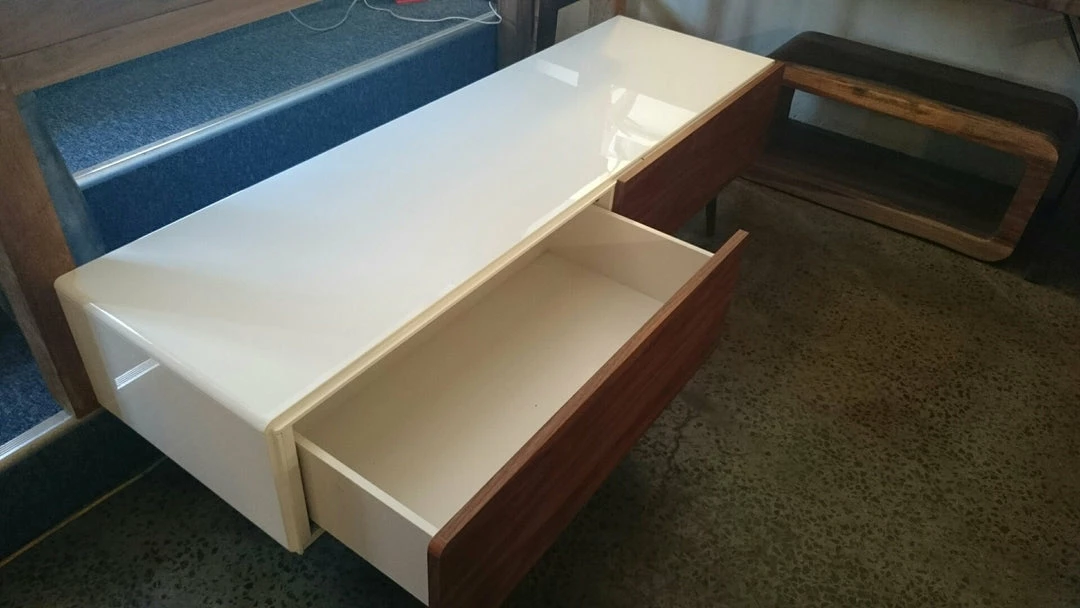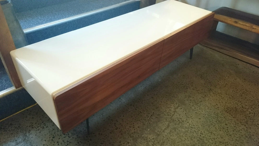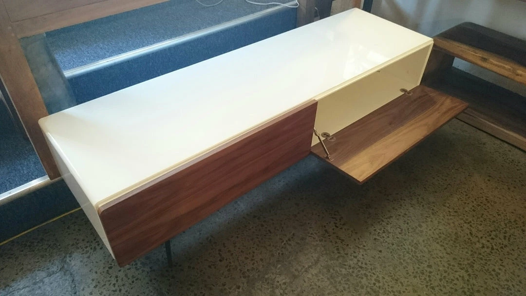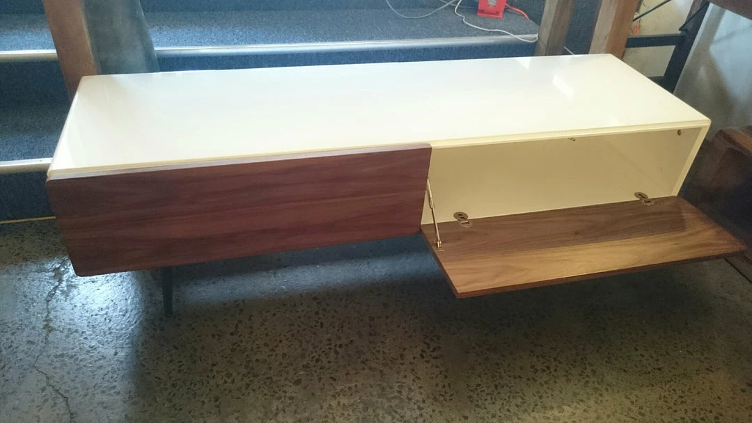 The City Media Unit couples a sleek aesthetic with retro elements to create a contemporary look sought after in modern homes. Contained within are storage drawer and a flap down door revealing ample space for most modern equipment. Cutout in the back of the cabinet facilitate cable access and ventilation.