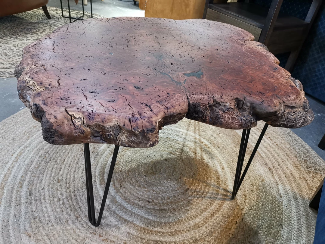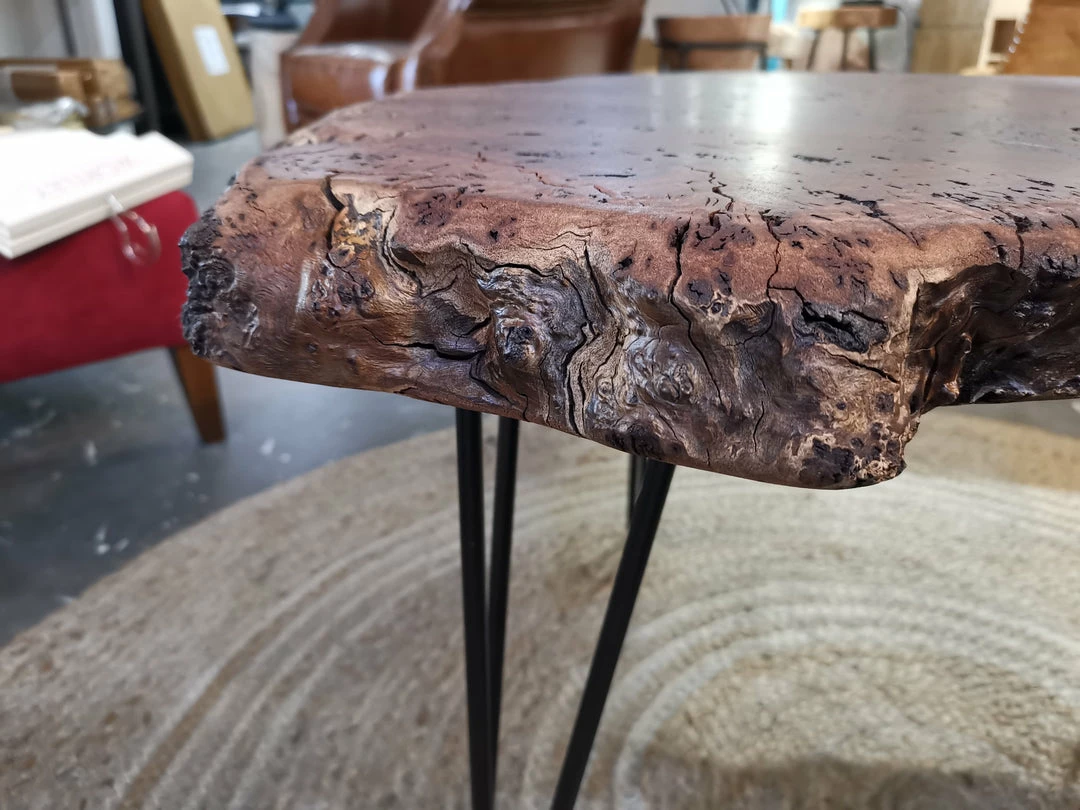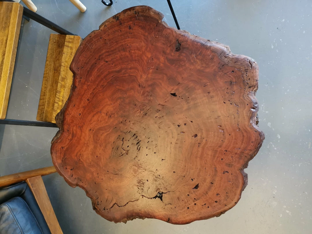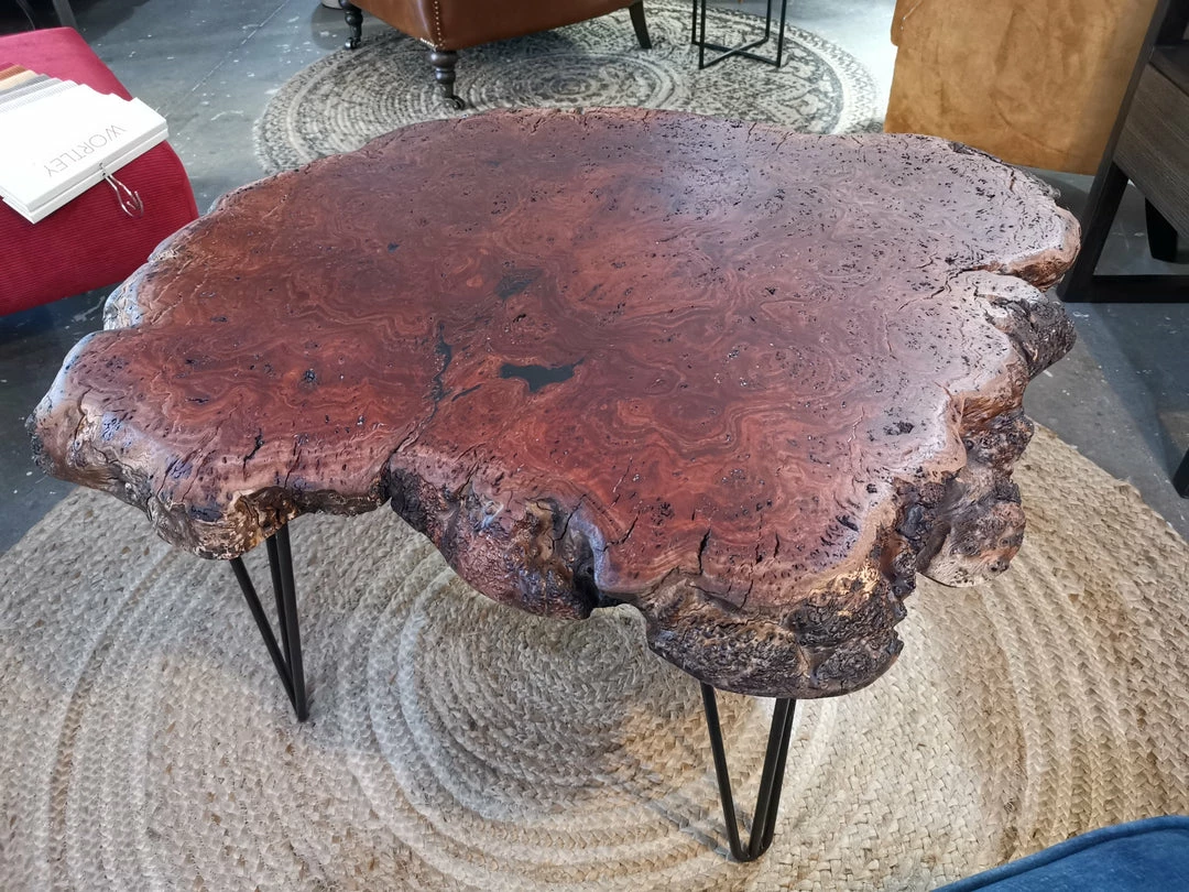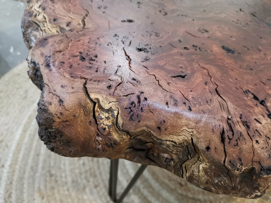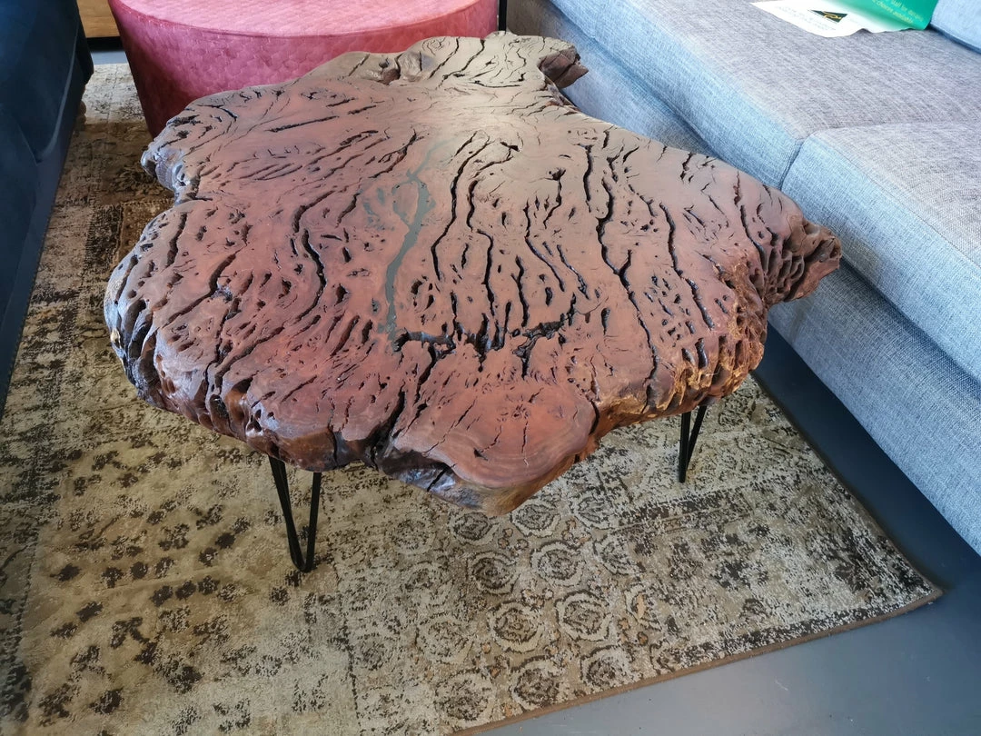 The tables are made from the Burl of old river red gum trees in the Koondrook state forest, surrounding the Murray River. Each of these burls were cut down for the health of the tree between 20 and 40 years ago, by a licensed arborist. After slabbing, the burl slabs have been left to dry for 5-10 years before being made into furniture.