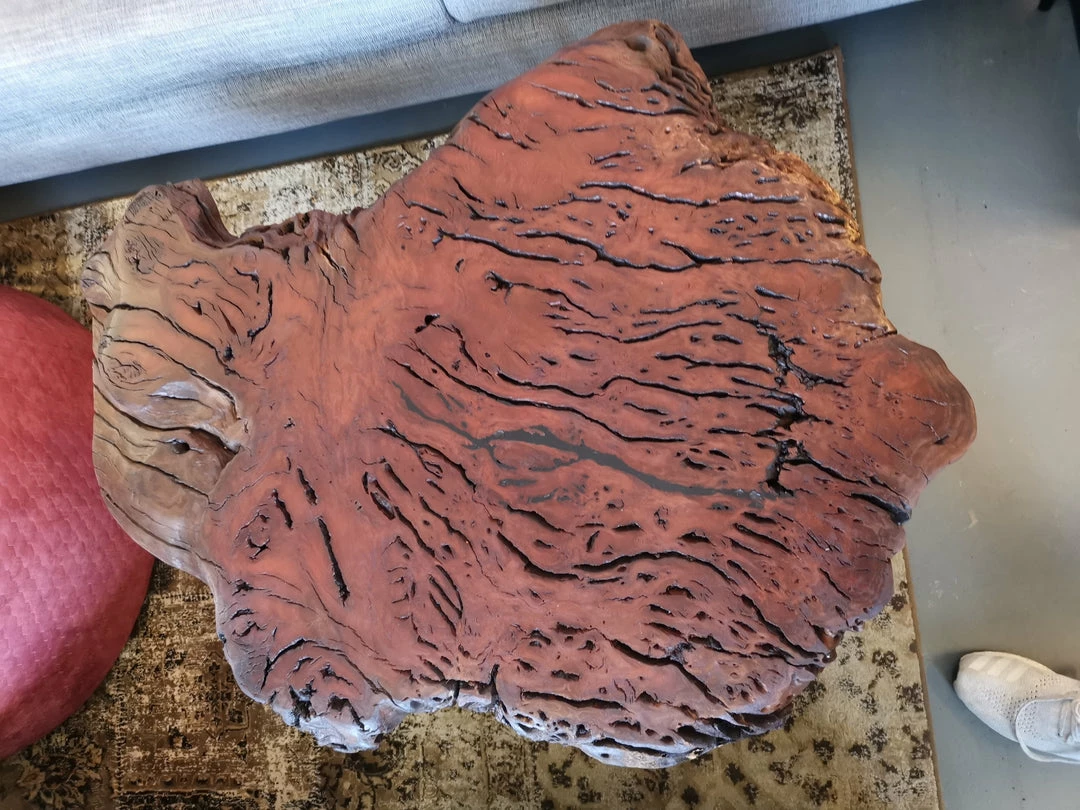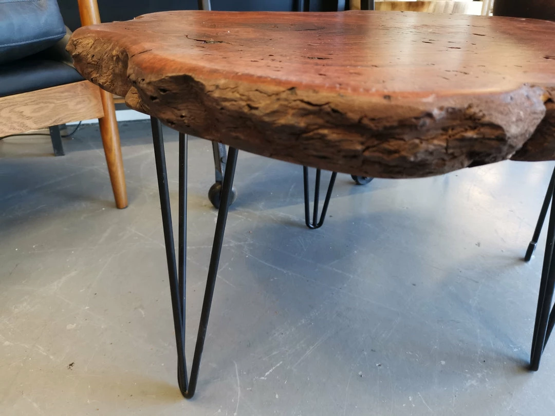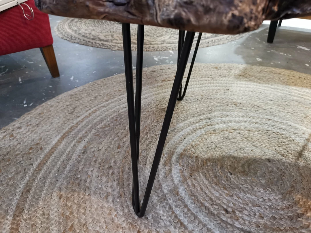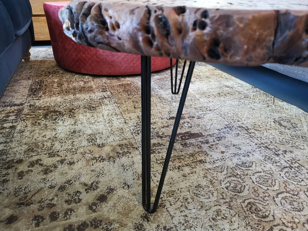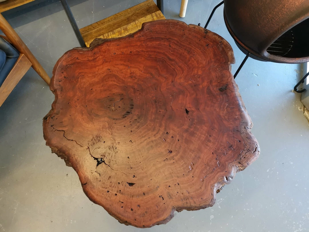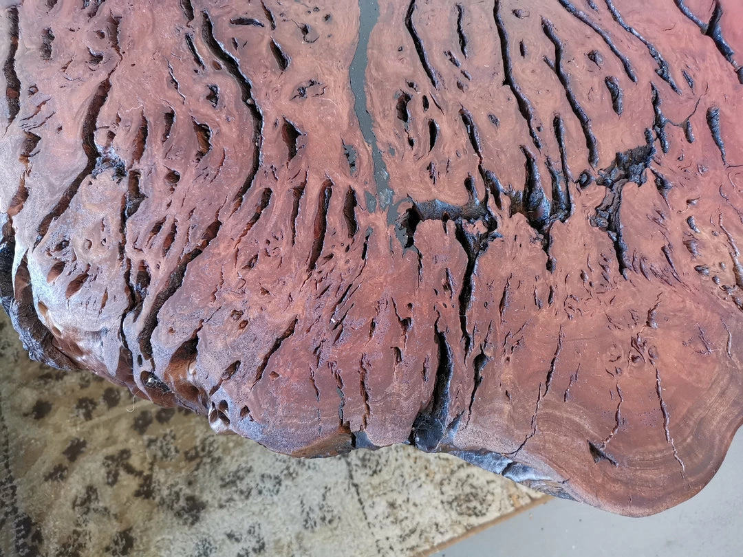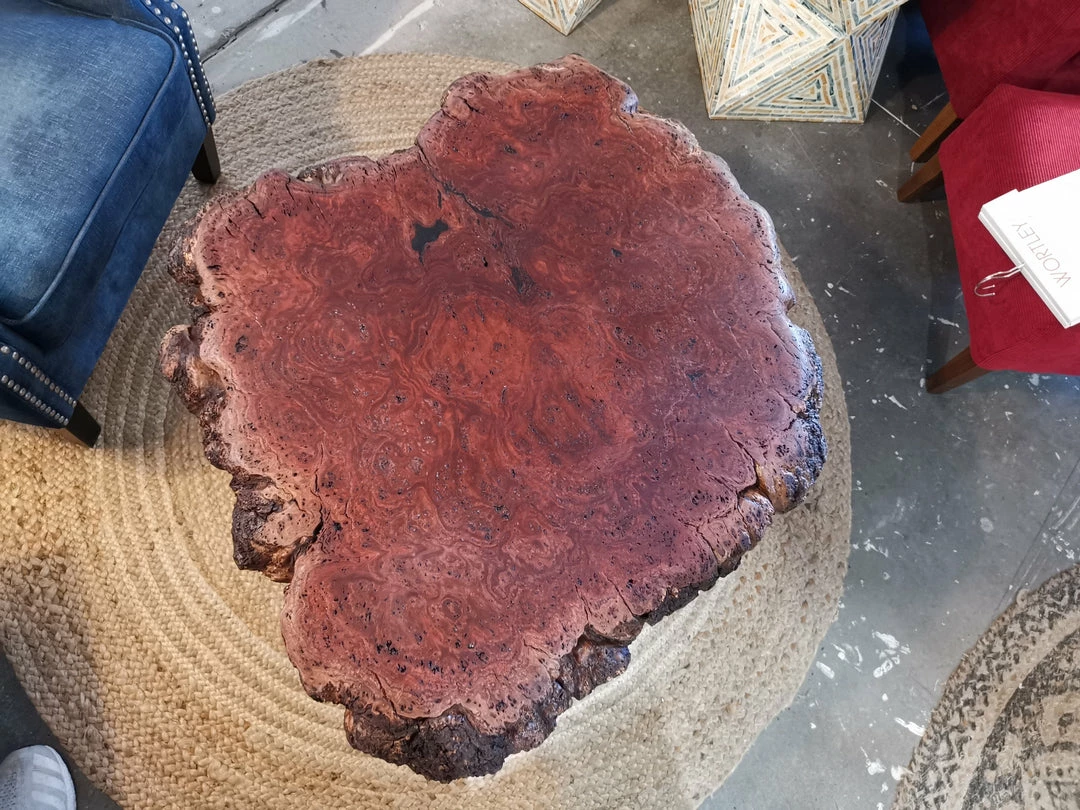 The tables are made from the Burl of old river red gum trees in the Koondrook state forest, surrounding the Murray River. Each of these burls were cut down for the health of the tree between 20 and 40 years ago, by a licensed arborist. After slabbing, the burl slabs have been left to dry for 5-10 years before being made into furniture.