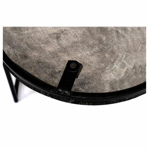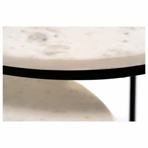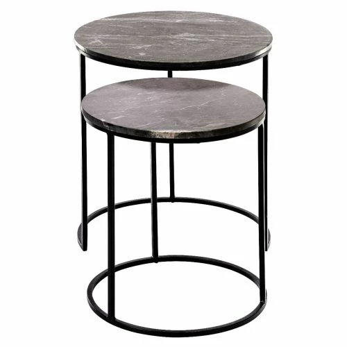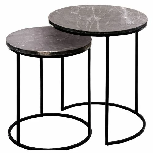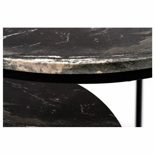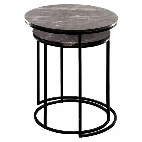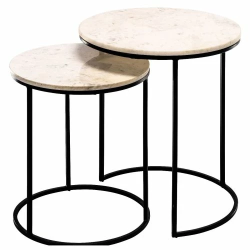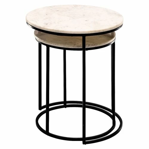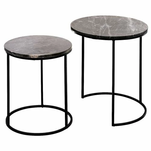 Marble side tables are constructed of a solid marble top and painted black metal legs. Natural marble exhibits variances in vein colour. These variations are normal characteristics of all marble species.