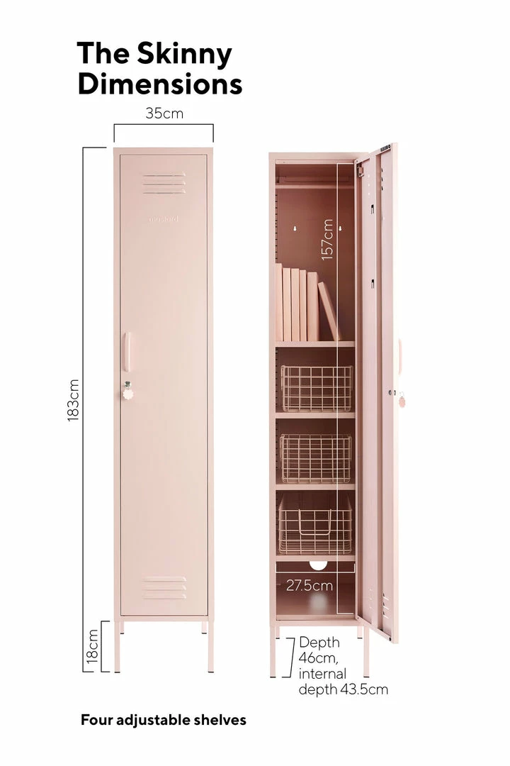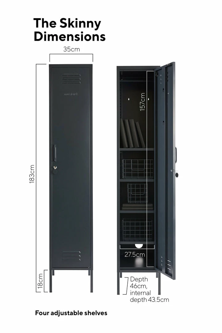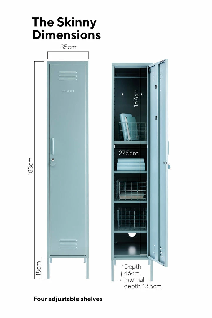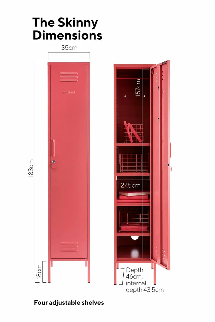 The Skinny Locker wants to help. She’ll keep your stuff neat and tidy. Standing alone or in paired with friends The Skinny is elegant, beautiful and practical.