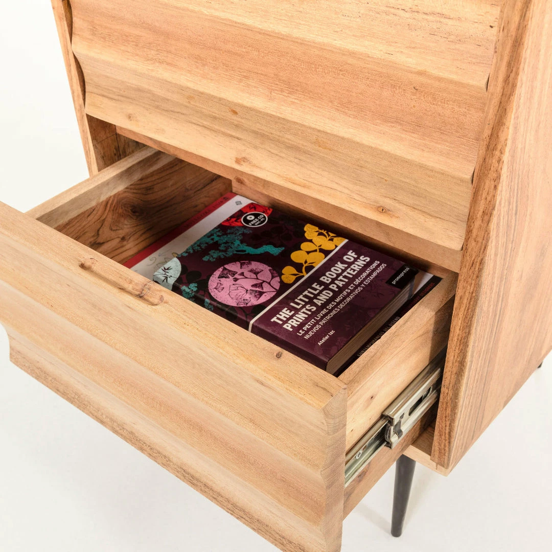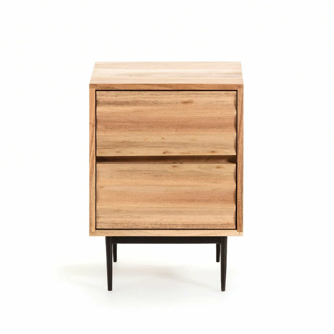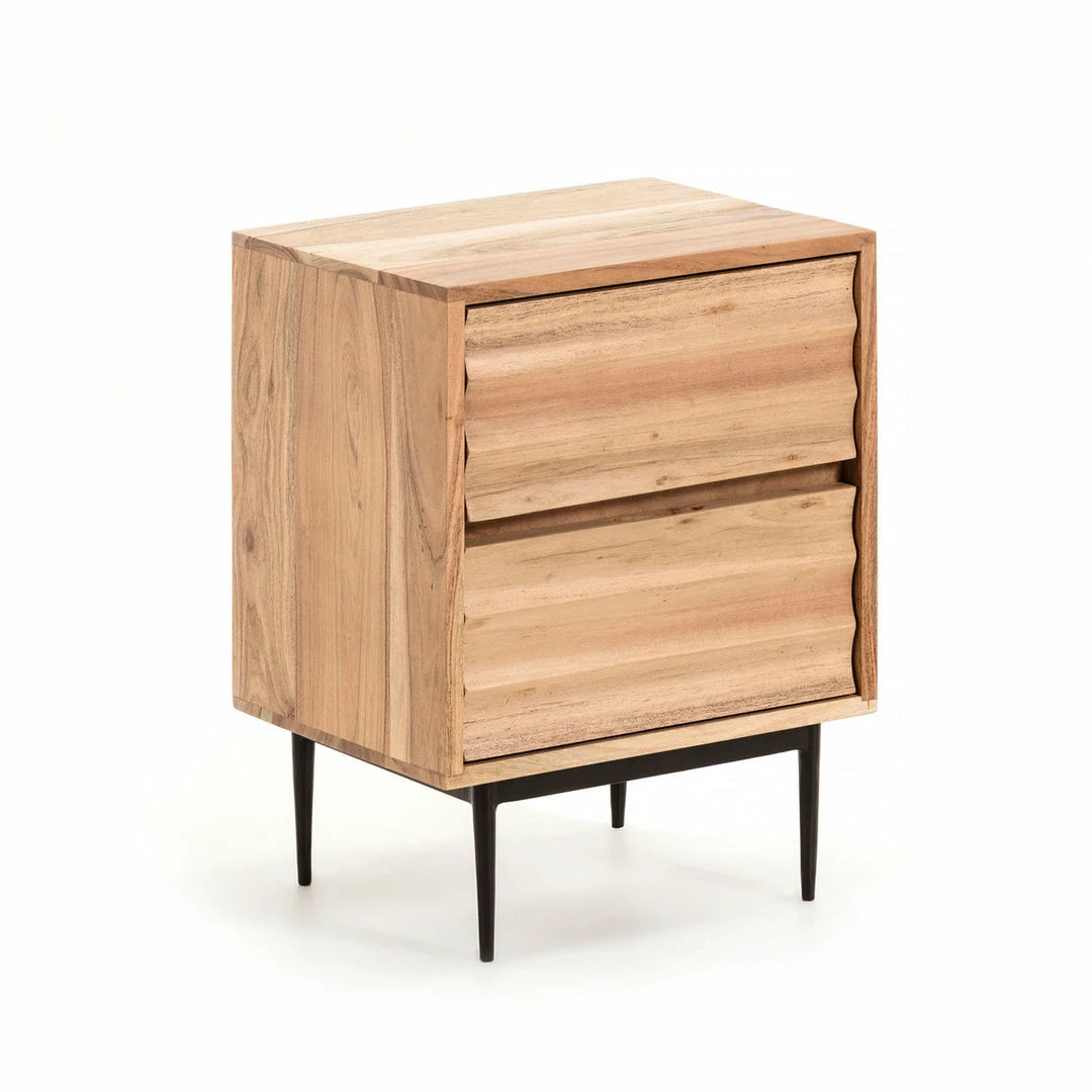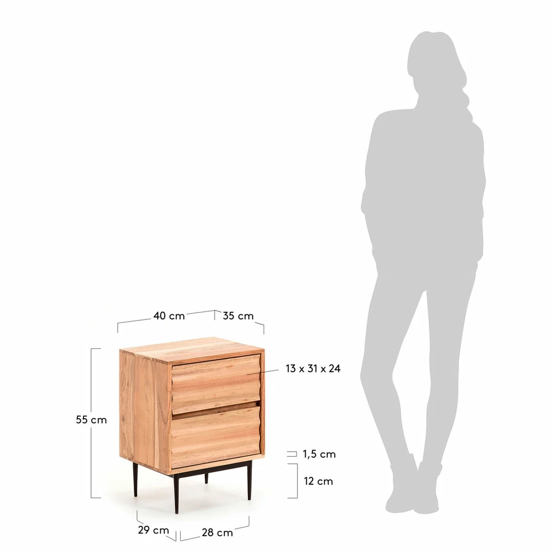 Delsie bedside table is 100% handmade and is constructed of solid acacia wood with a natural finish. In addition, it has decorative detail on the draws with different depths which are also handmade. The legs are metal painted black. A designer piece that, in addition to having character, has a unique personality. Natural timbers may exhibit variances in grain, colour and texture, sometimes visible knots, filling and butterfly joints will be evident and it can change colour with age. These variations are normal characteristics of all timber species.