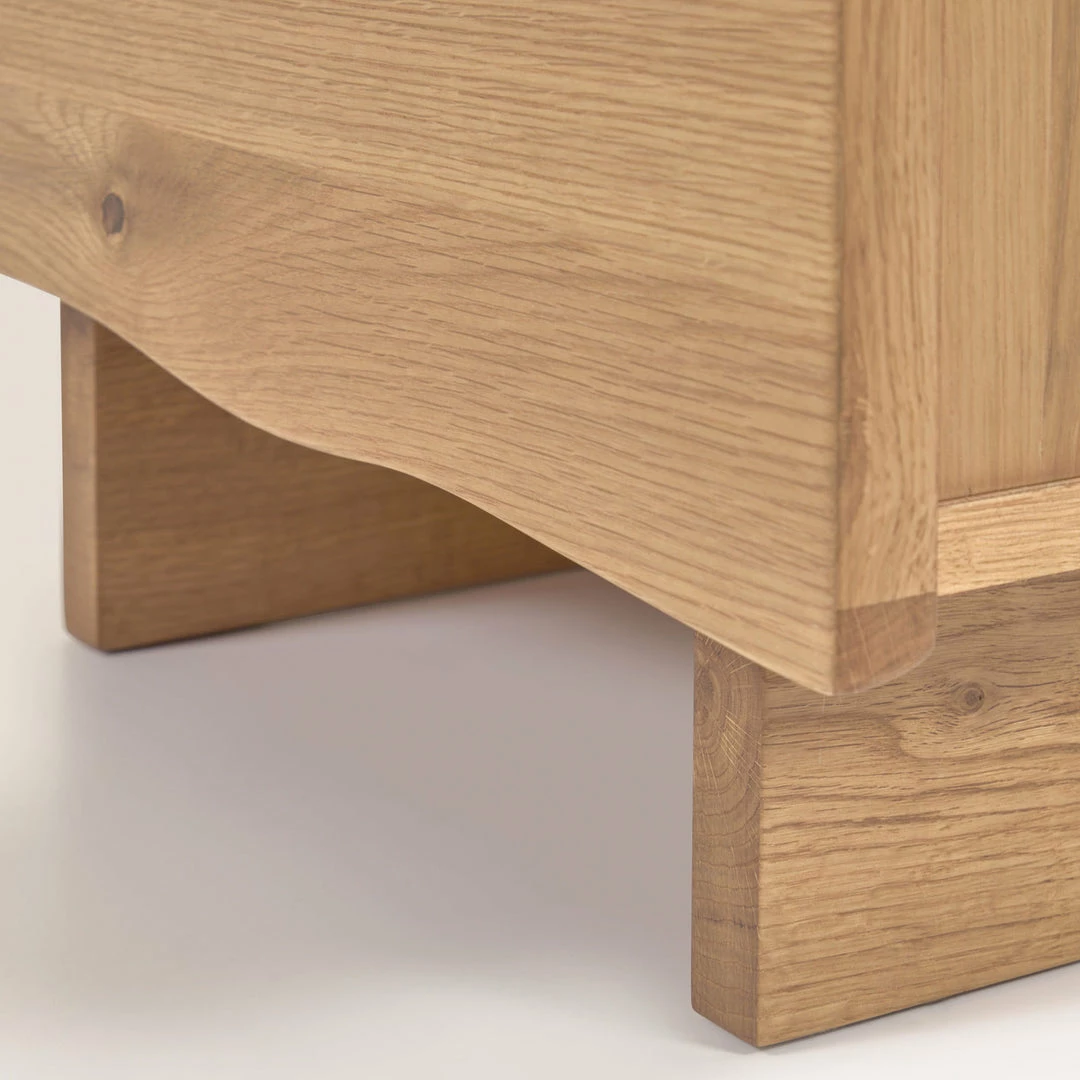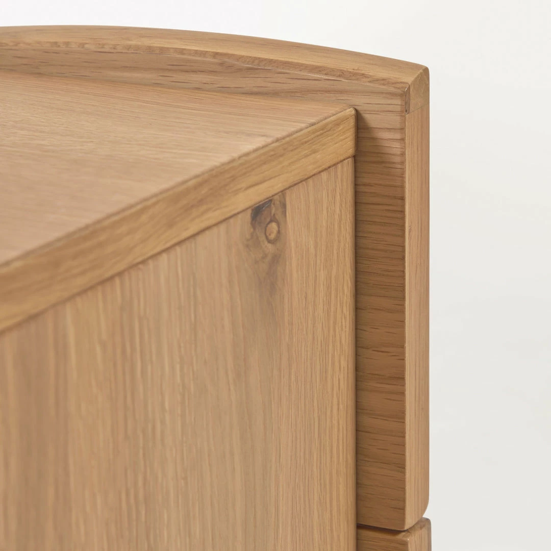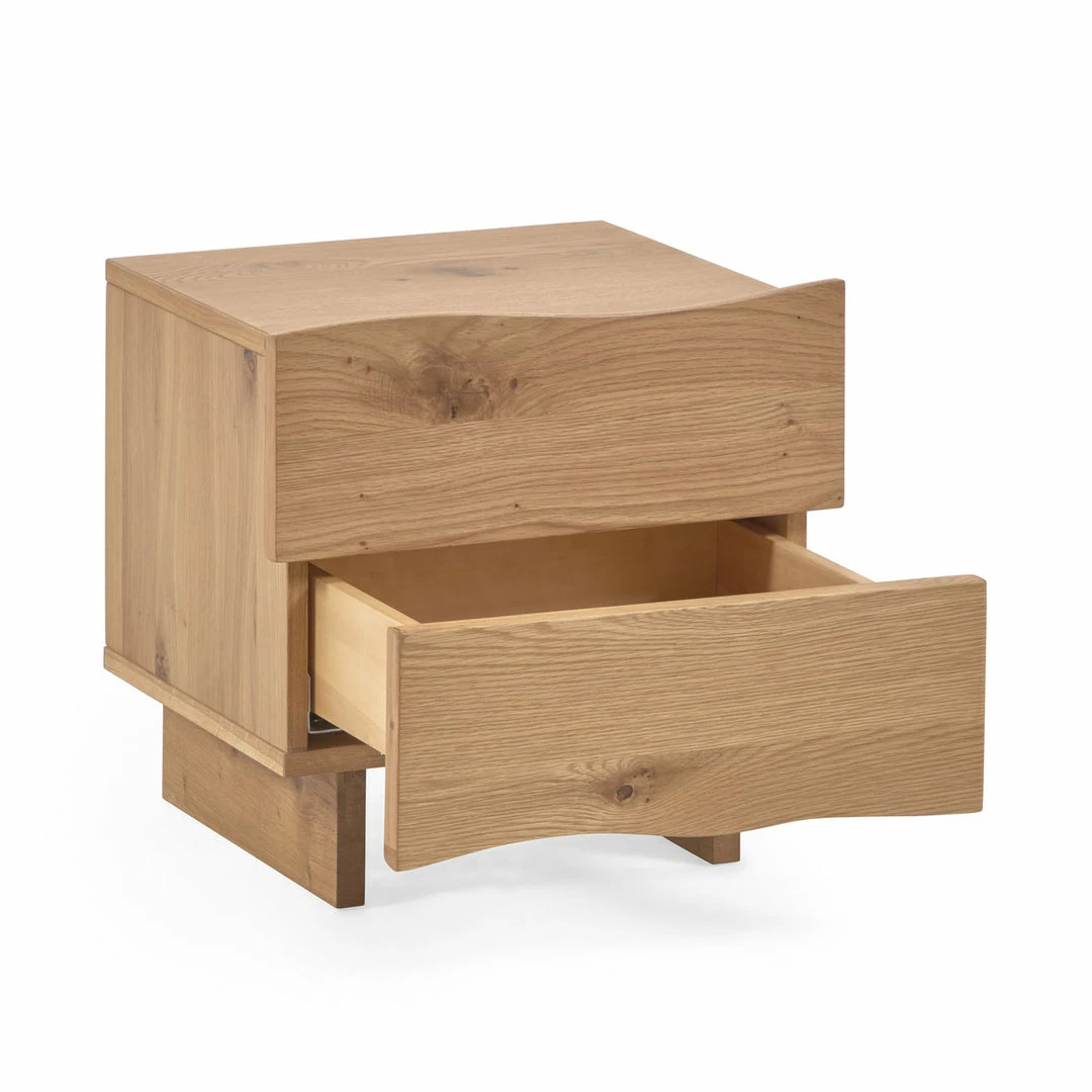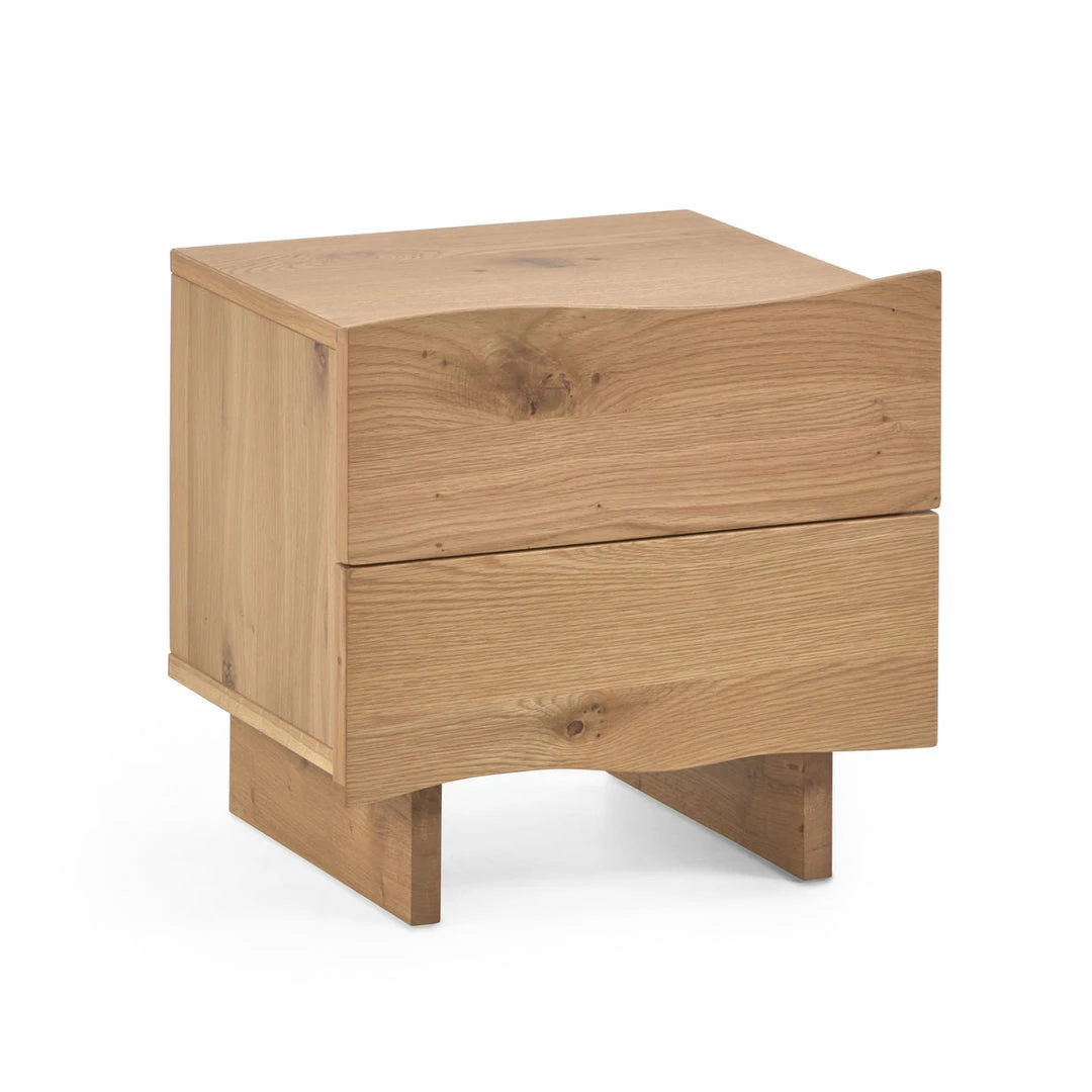Rasha bedside table is a natural timber finish product of oak veneer and drawers faced with solid oak edges with an irregular cut. The irregular cut of Rasha sustainable oak veneer makes it totally unique. A design that puts wood front and centre to reveal unique tones, shapes and grains and whose curved edges create organic, exclusive shapes. Features include: hidden runners with soft-close system and adjustable legs.