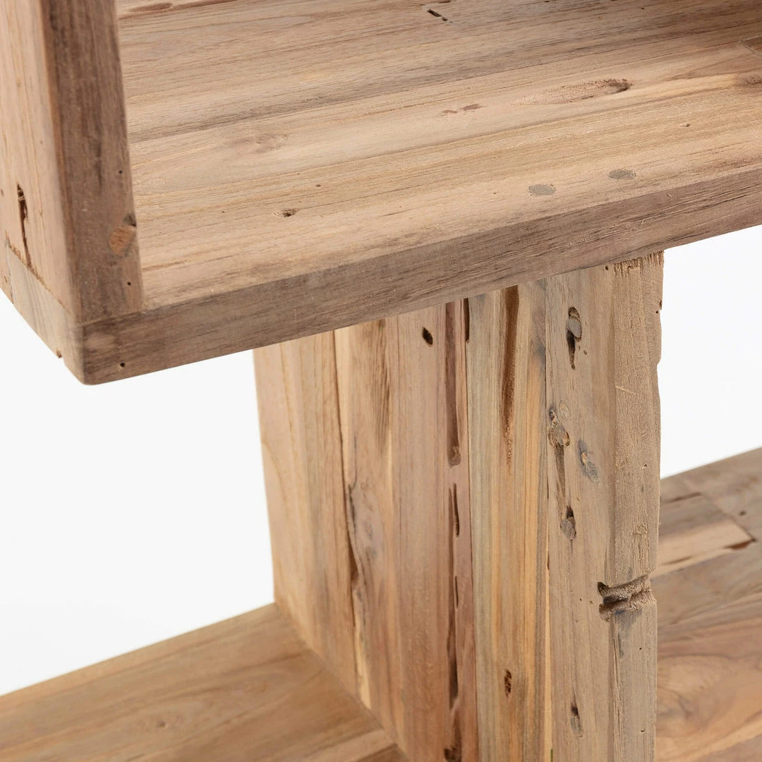 The Arundal shelving unit is crafted from recycled teak wood with a natural finish. Each piece is designed to highlight the original timber detailing and patinas, creating a unique and one off item.