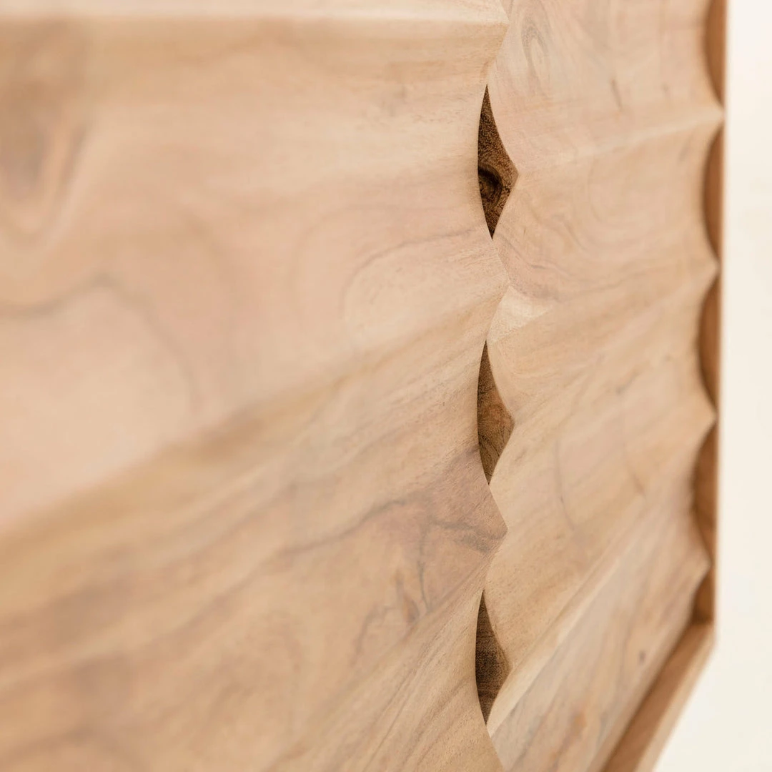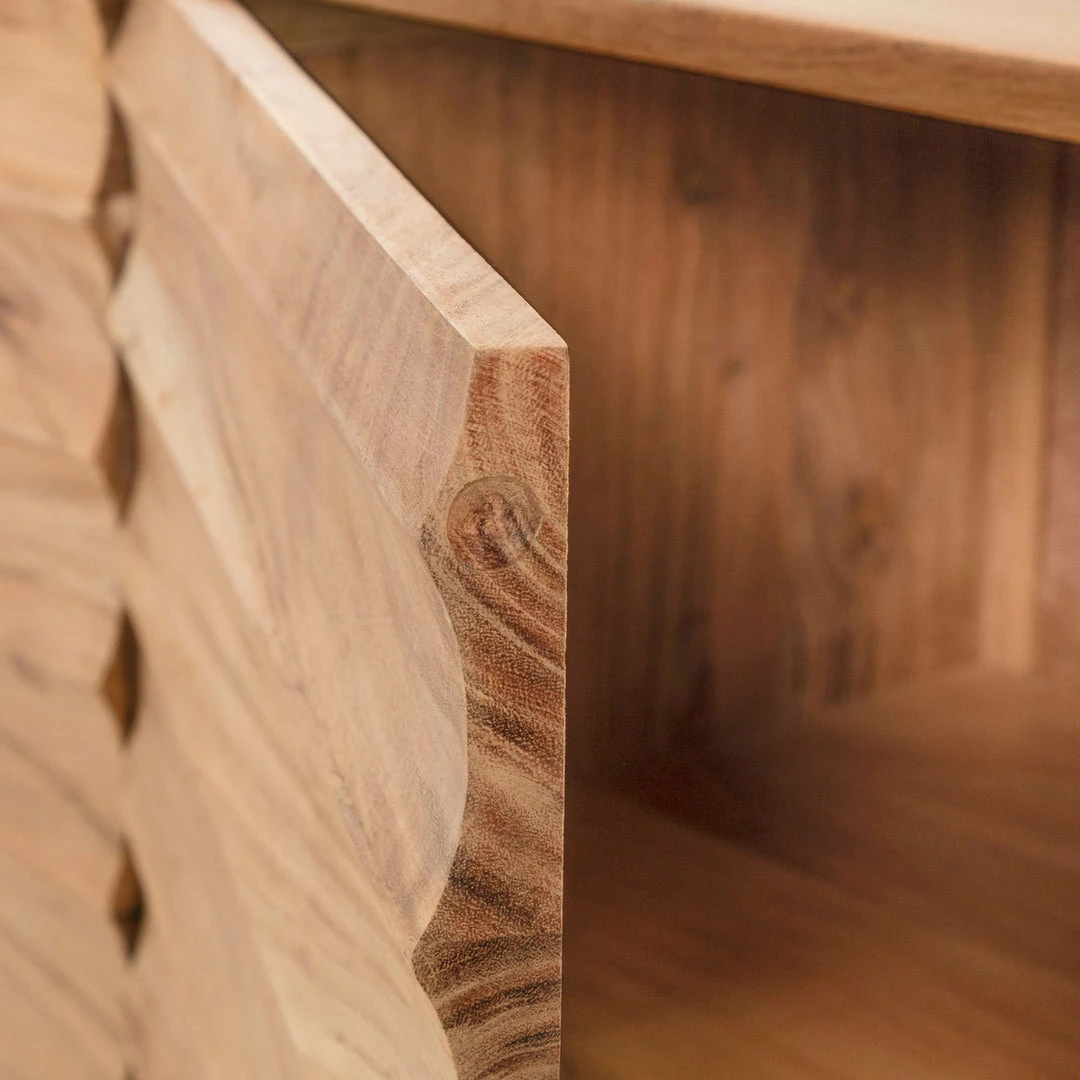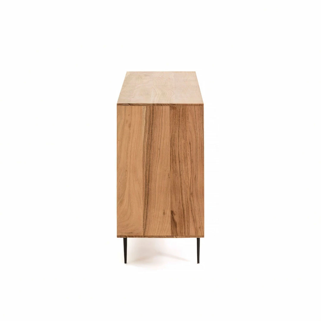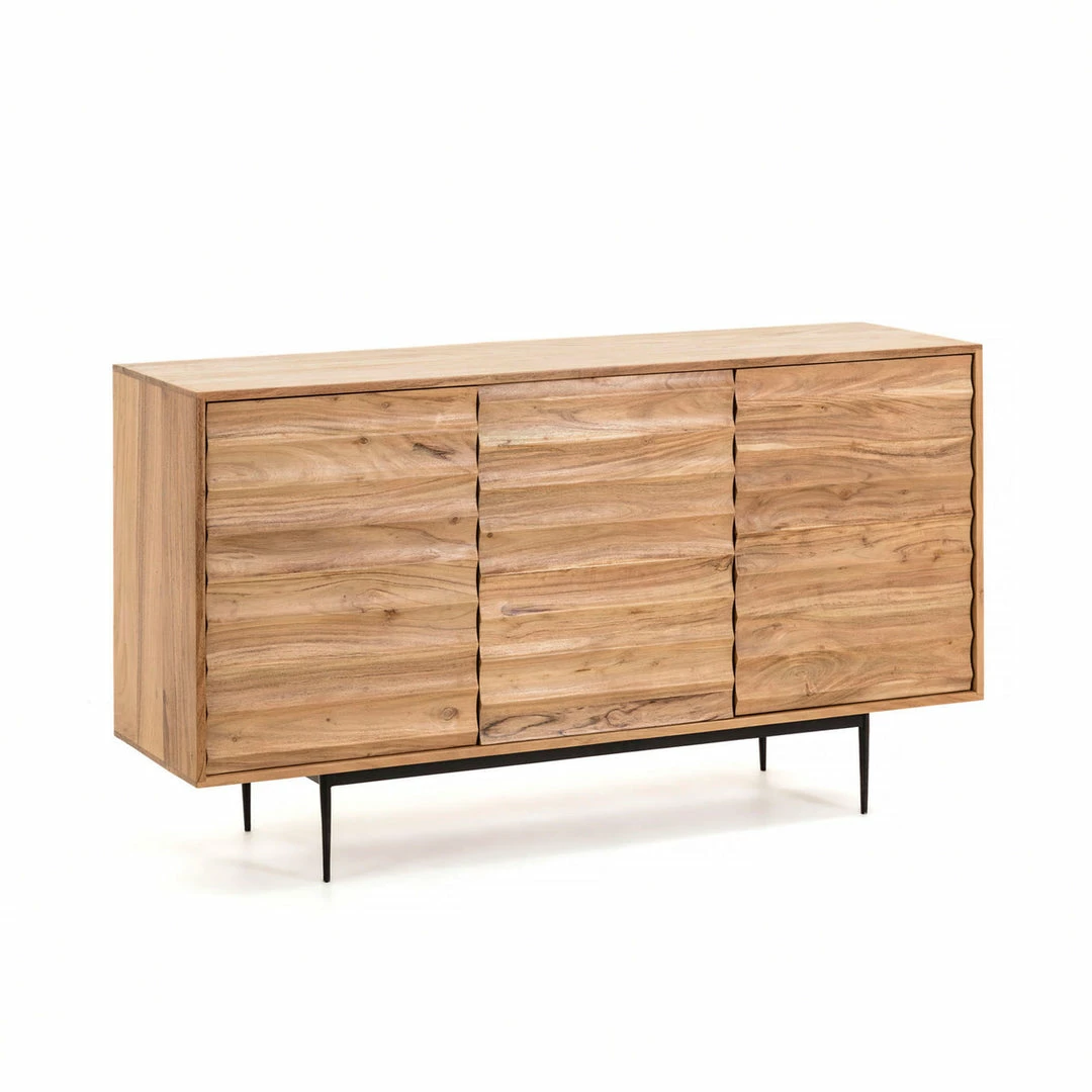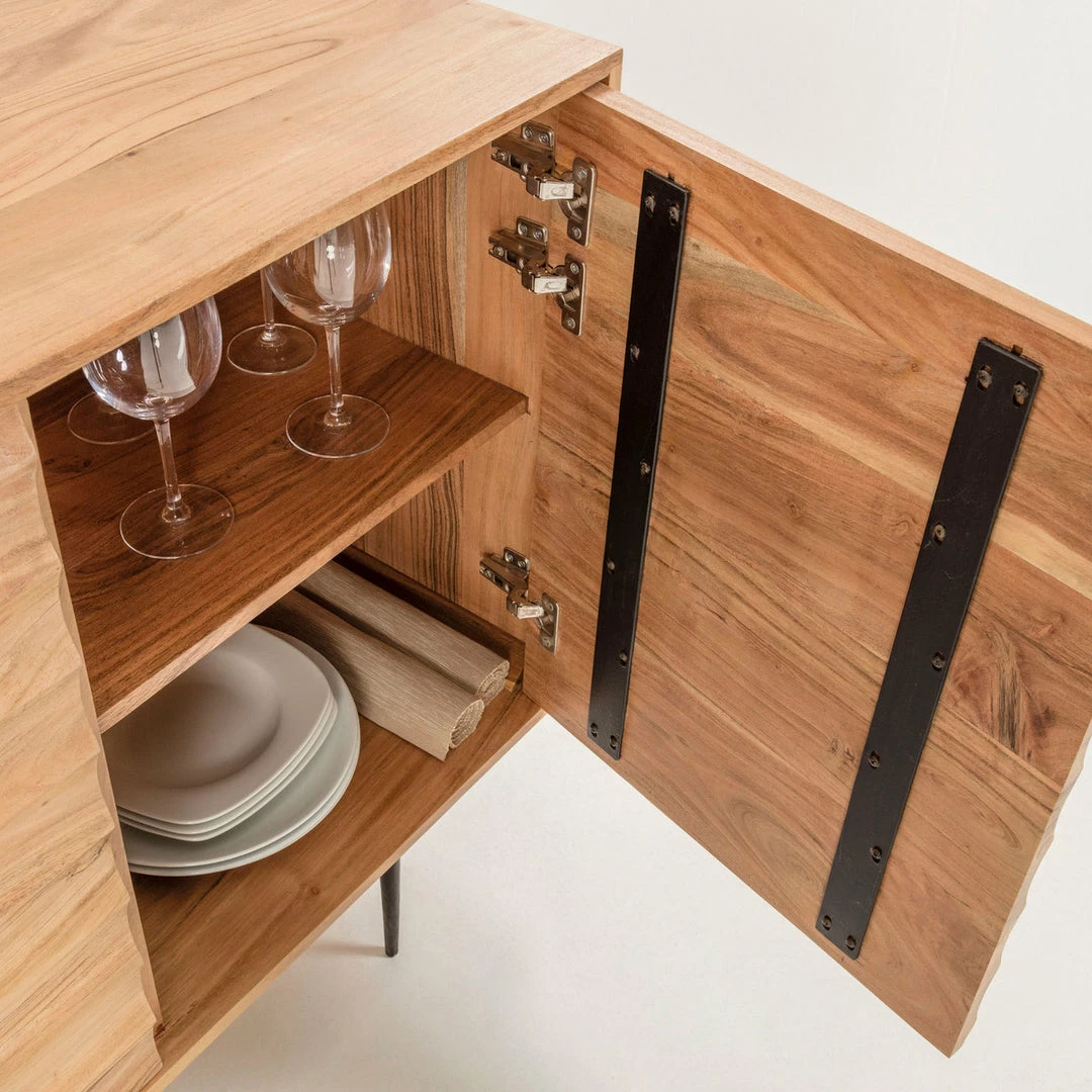 Delsie sideboard unit is 100% handmade and is constructed of solid acacia wood with a natural finish. In addition, it has decorative detail on the doors with different depths which are also handmade. The legs are metal painted black. A designer piece that, in addition to having character, has a unique personality. Natural timbers may exhibit variances in grain, colour and texture, sometimes visable knots, filling and butterfly joints will be evident and it can change colour with age. These variations are normal characteristics of all timber species.