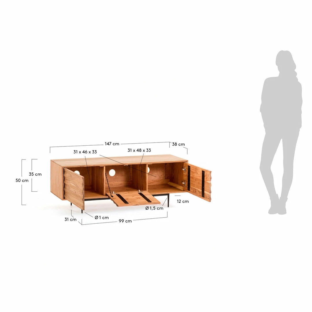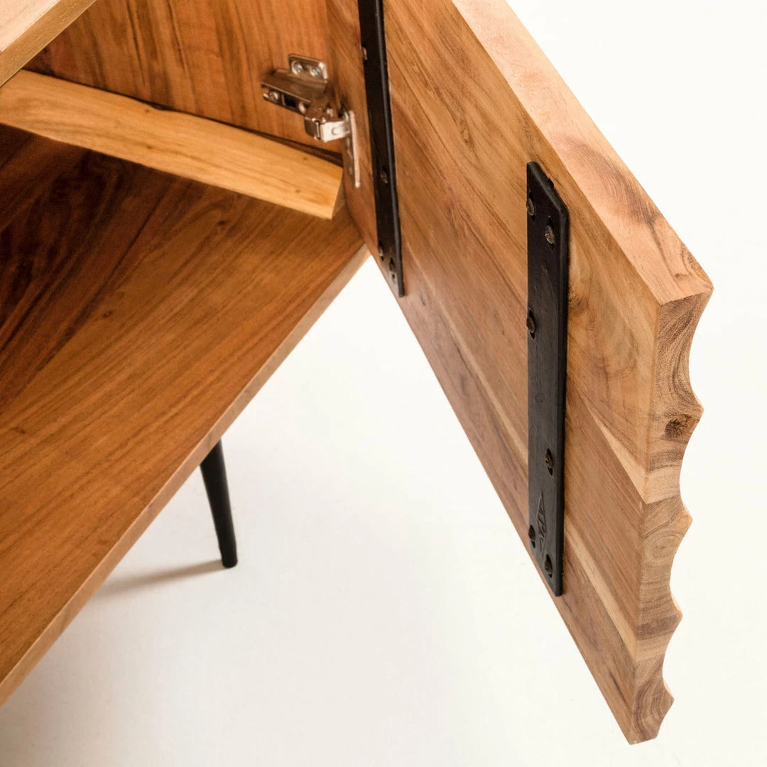 Delsie entertainment unit is 100% handmade and is constructed of solid acacia wood with a natural finish. In addition, it has decorative detail on the doors with different depths which are also handmade. The legs are metal painted black. A designer piece that, in addition to having character, has a unique personality. Natural timbers may exhibit variances in grain, colour and texture, sometimes visable knots, filling and butterfly joints will be evident and it can change colour with age. These variations are normal characteristics of all timber species.
