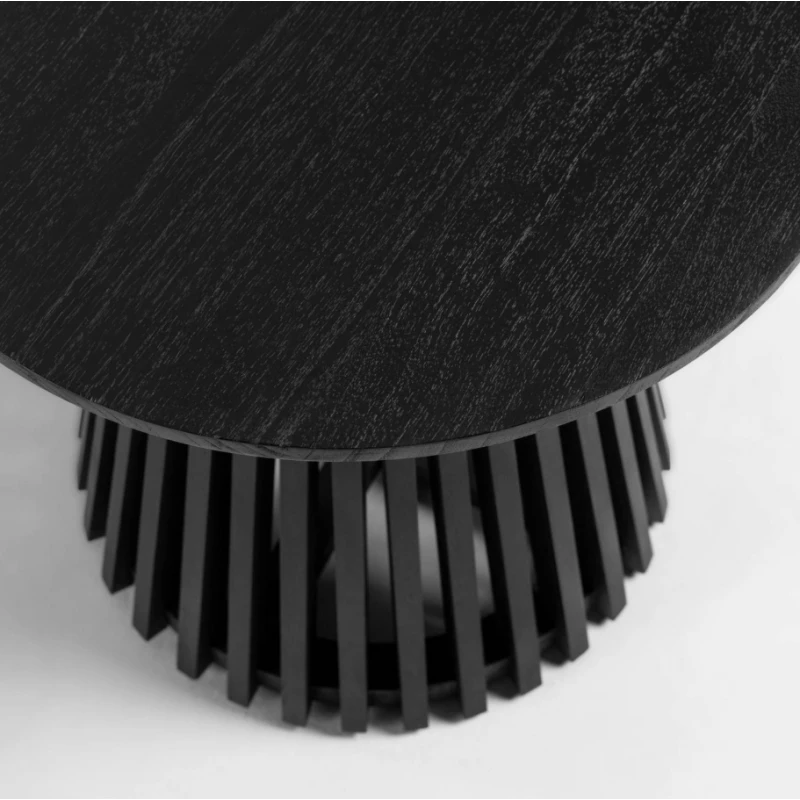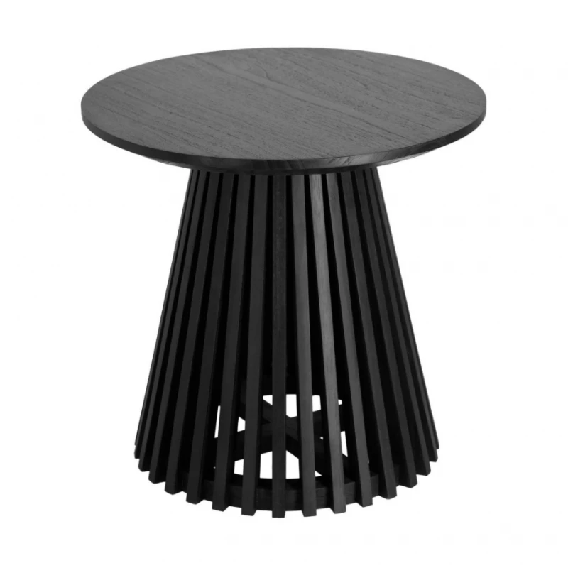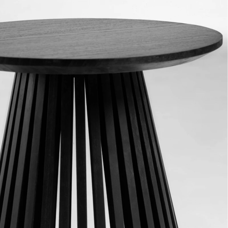 Slatted base solid mindi wood side table with a blackl finish. Mindi wood is FLEGT certificate (Forrest Law Enforcement Government and Trade) and is therefore eco-friendly and sustainably sourced. Also available in solid teak with natural finish. This range also includes a dining table and coffee table (see website).