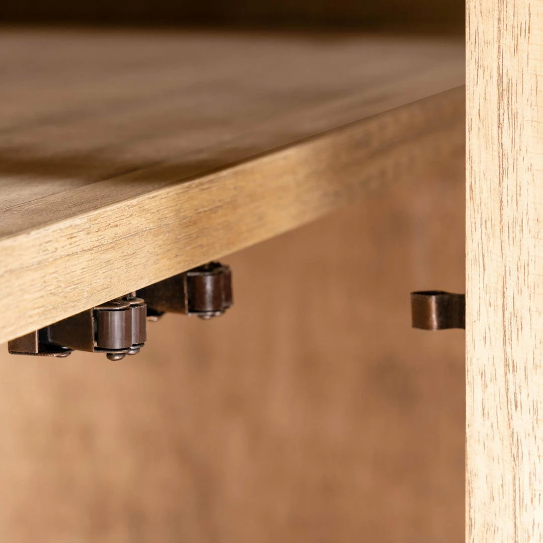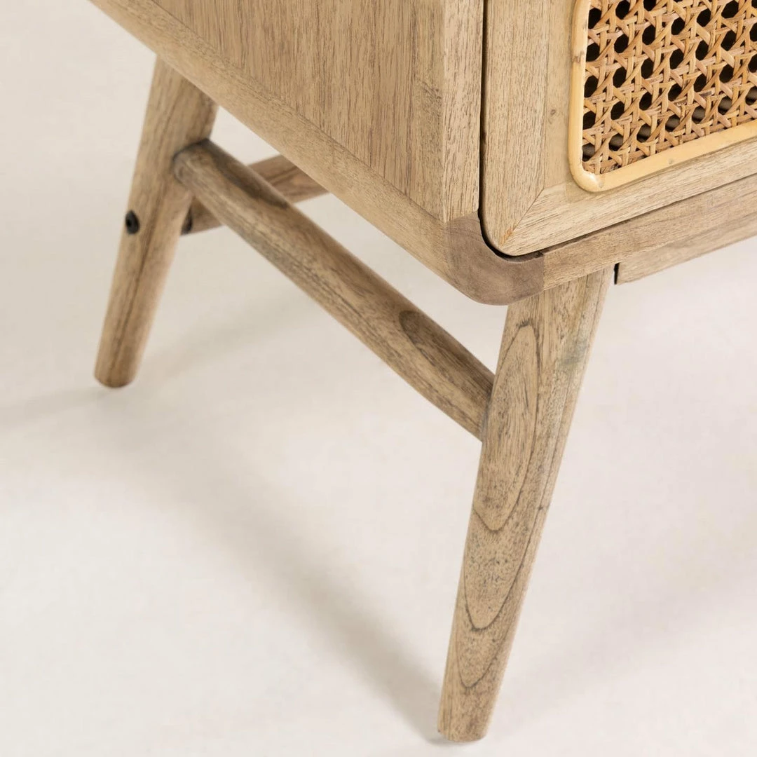 Nalu sideboard is made from solid mindi wood with aged effect. To make the structure the wood has been curved to round the ends. To add a trendy touch the front is made from hand-braided rattan. It is an eco-friendly designer piece as the wood comes from a responsible felling and sustainable forests. Natural timbers may exhibit variances in grain colour and texture sometimes visible knots filling and butterfly joints will be evident and it can change colour with age. These variations are normal characteristics of all timber species.