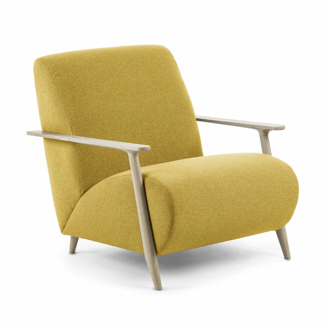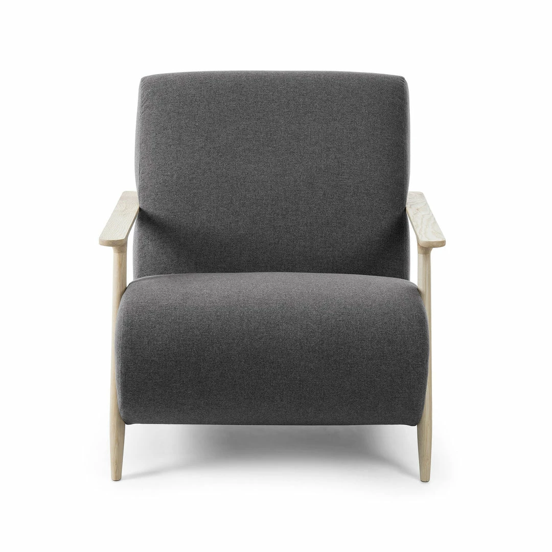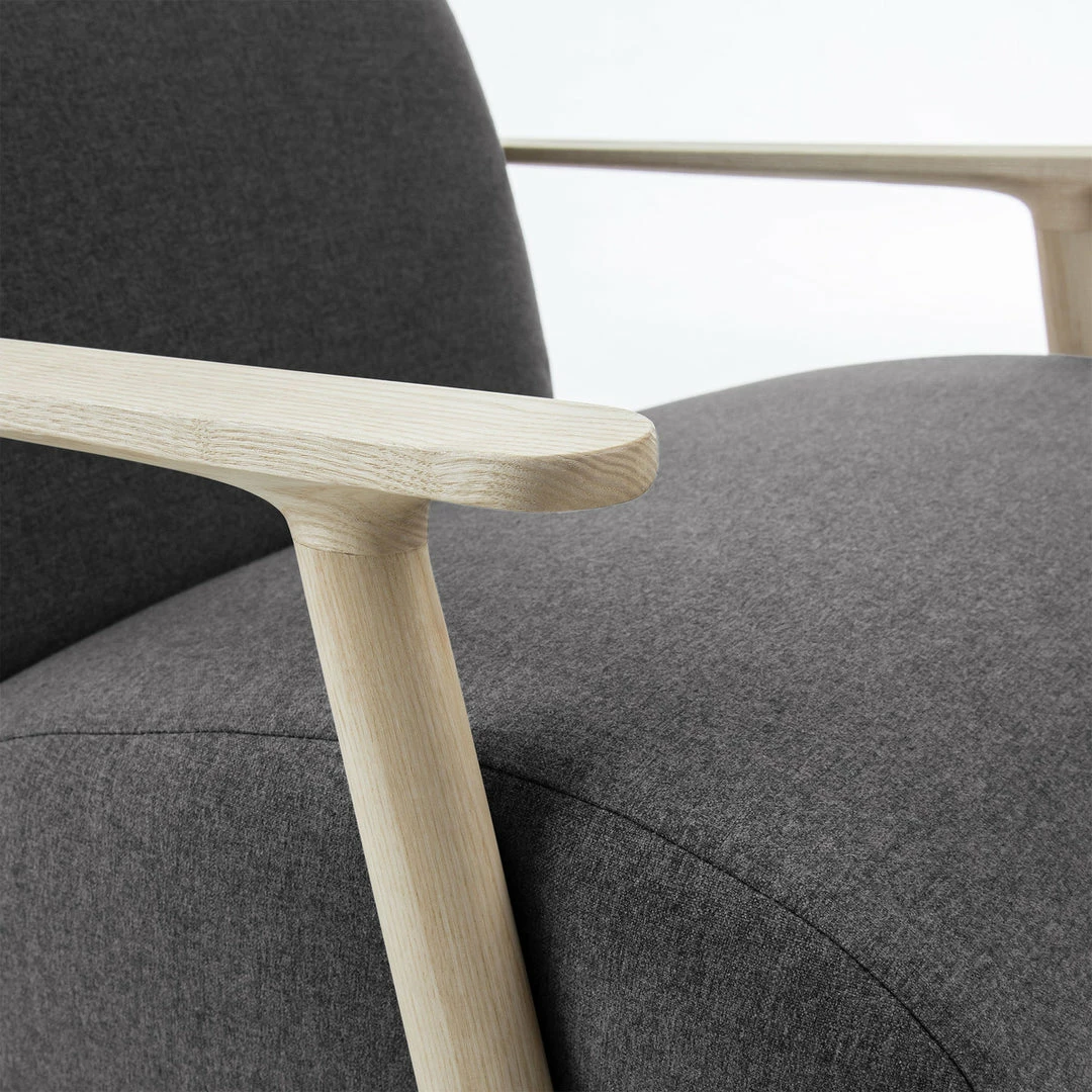 Fully upholstered armchair with anti-stain Teflon treated fabric. Arms are constructed of solid natural ash wood.
