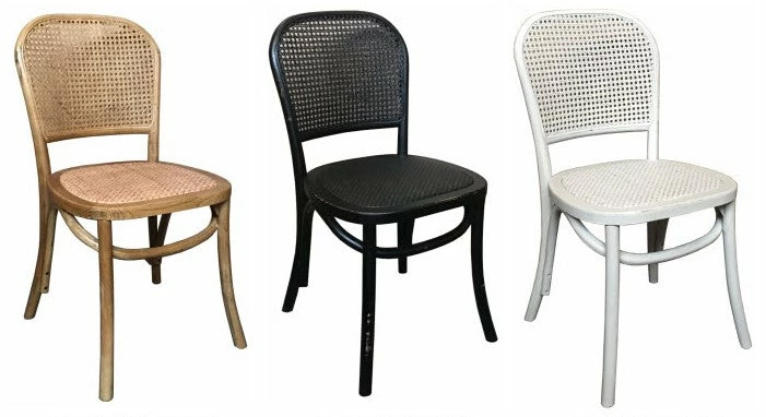 Combining French Provincial design and Parisian chic style, these patterned back chairs will add an elegant and rustic touch of character to your dining room. Available in black, white, and natural.
