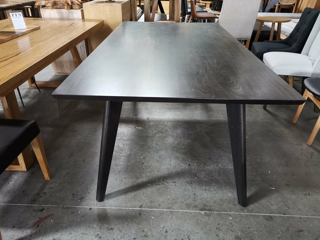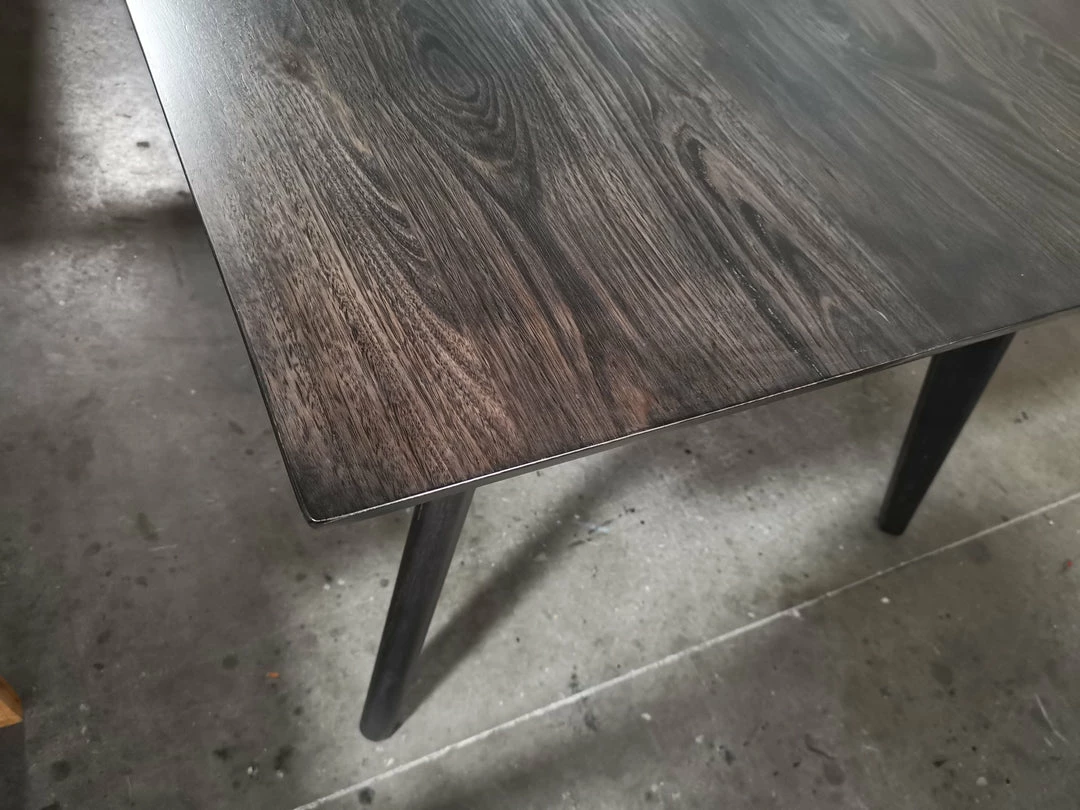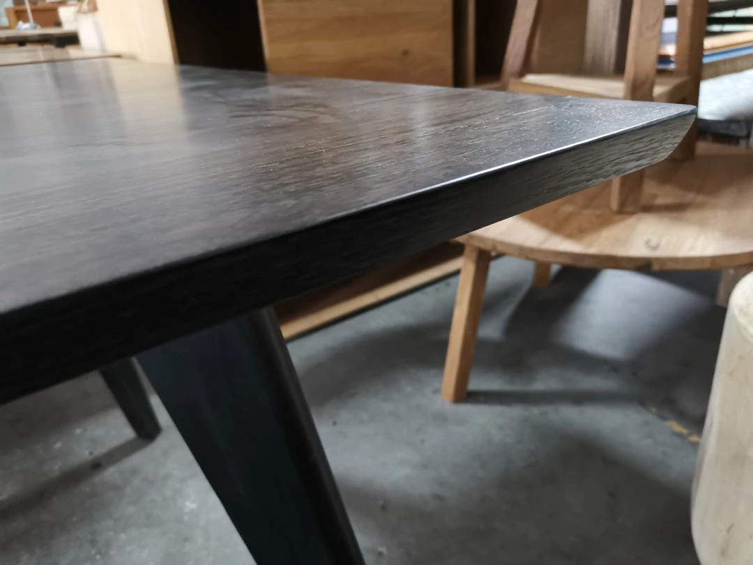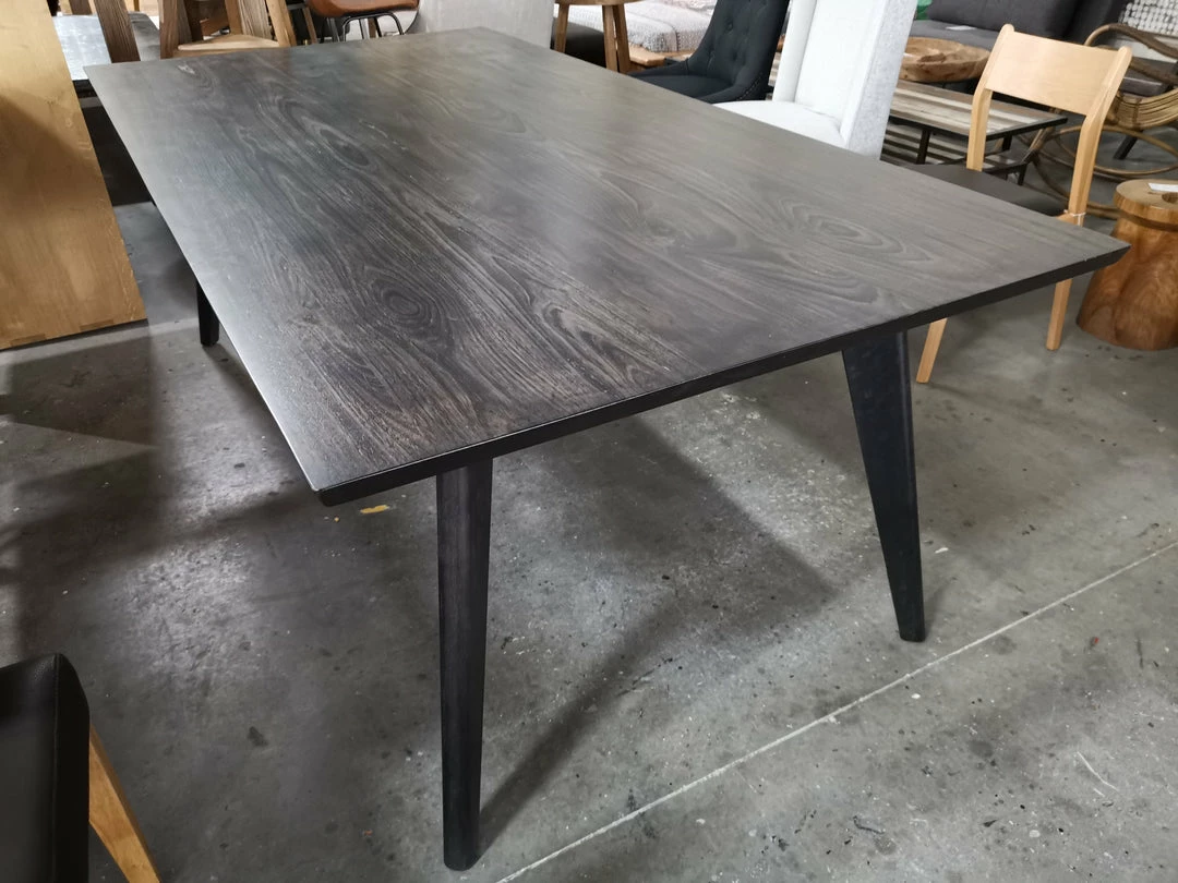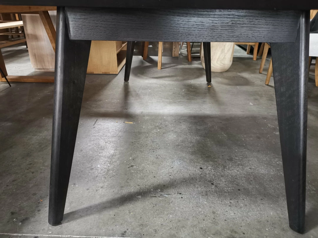Not ashamed to admit that this locally designed and made dining table is influenced by classic, Danish mid century furniture. The tapered, splayed legs softens the overall feel of the table. The shark nose profile of the top, adds to the elegance of this design.