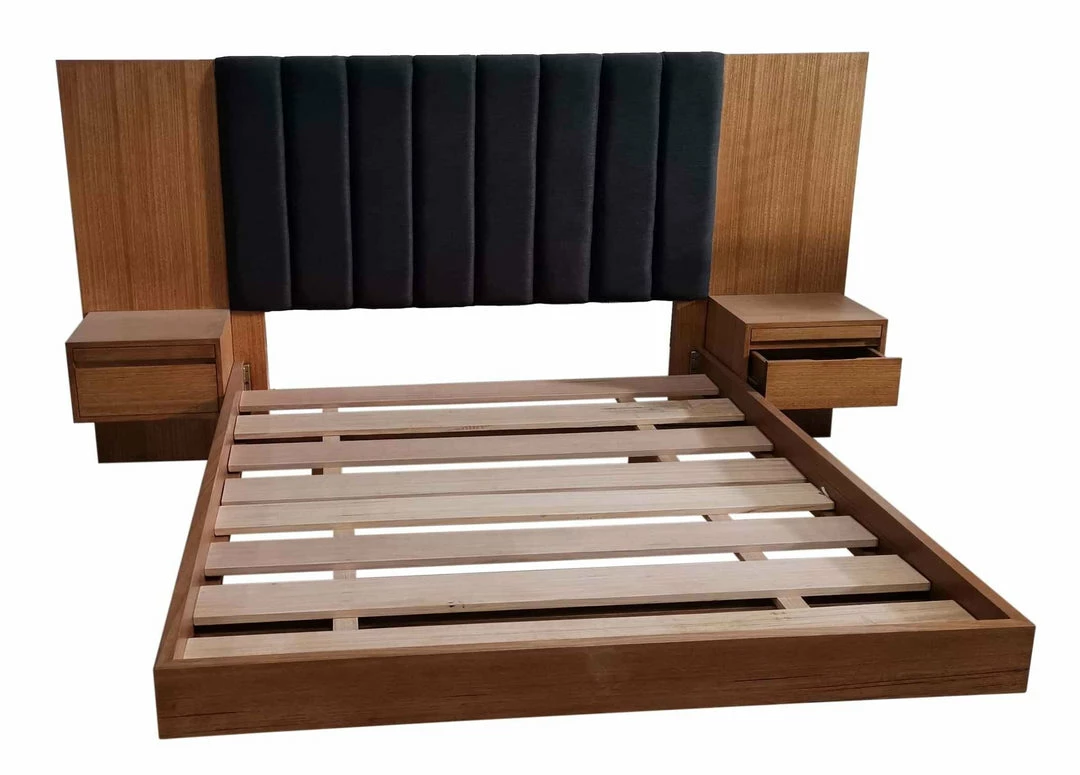 Locally made Solid Australian Messmate with feature grain. Mitred edge around base frame. Upholster your favorite color fabric in the bedhead or full timber panel.Bedside tables are joined to the bedhead. The legs are set in giving it a floating look. Bed can be unassembled for ease of delivery .