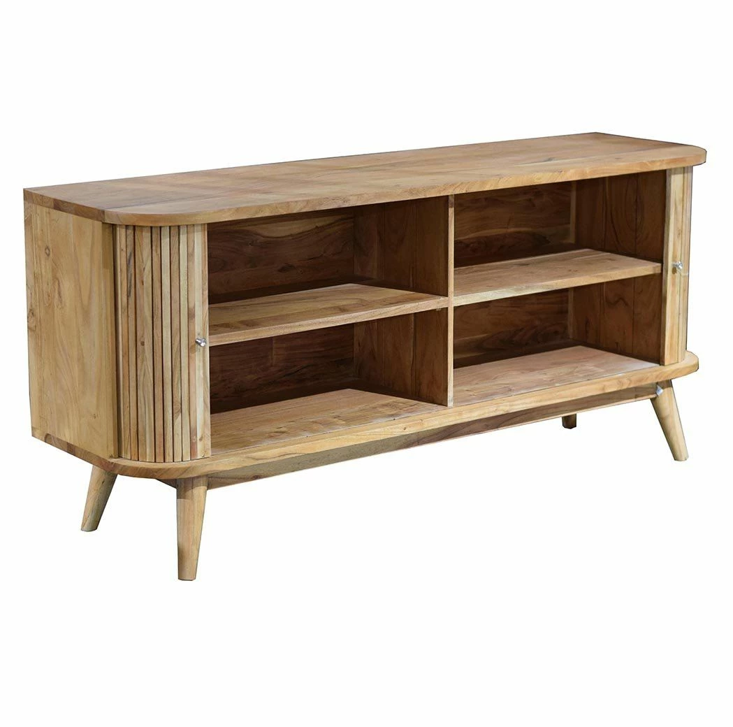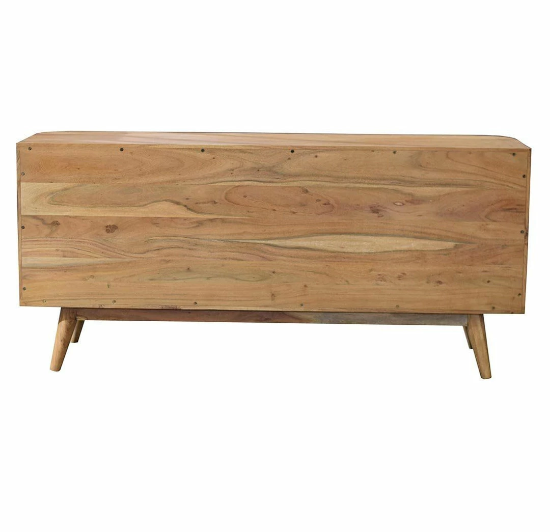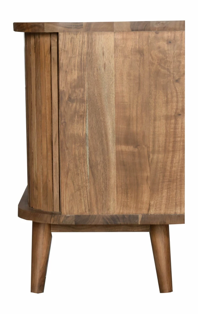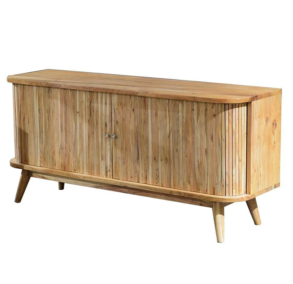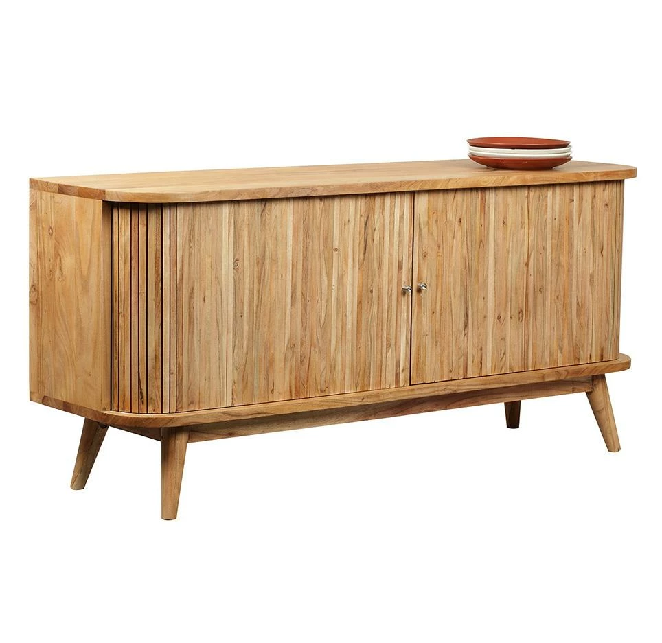 Yet another 60s inspired piece in our newest furniture collection, our Slatted Wooden Sideboard is a beautiful nod to the designs of that vintage period. This hardwood sideboard features a unique curved oblong shape. The rounded wooden storage panel contains two cabinet doors for ample storage. The look of this beautiful sideboard is made complete with matching wooden tapered legs. This is a beautifully designed and crafted piece that will suit a range of interior styles.
