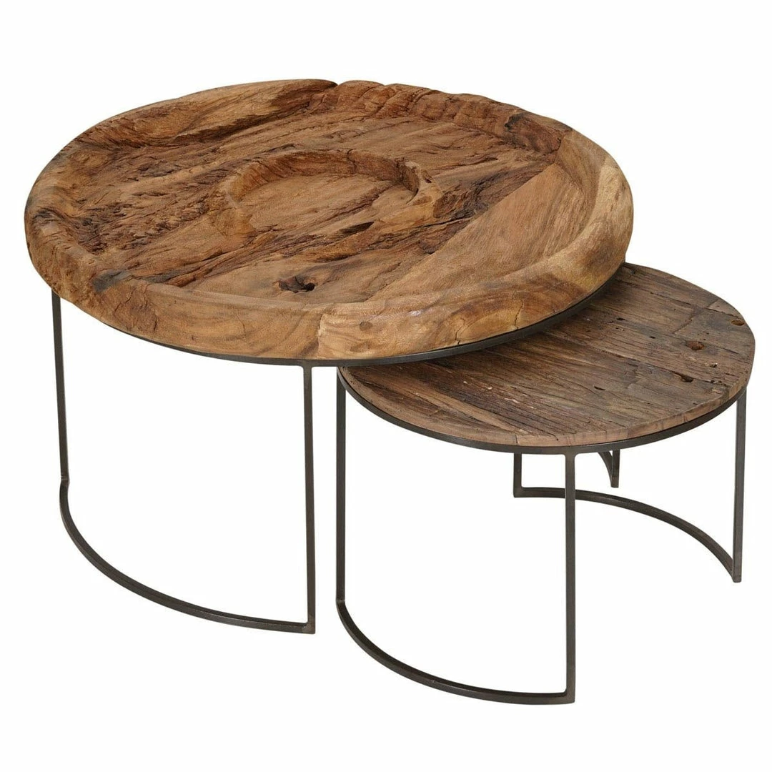 The larger coffee table is made from Suar wood, with powder-coated iron in a mottled metallic finish. It features a rounded lip edge with a recessed top and central storage lip. The smaller coffee table is made from reclaimed mixed hardwood timber in a rustic finish.
