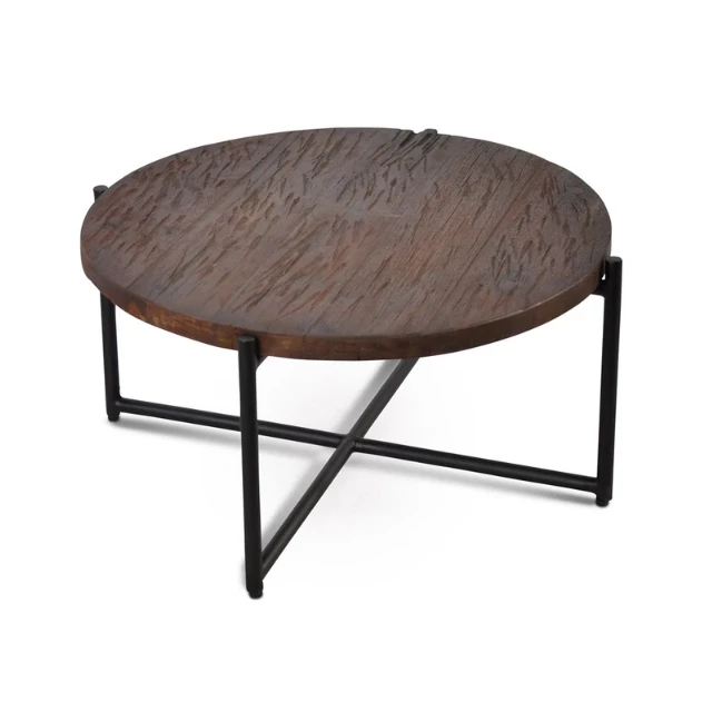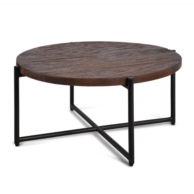 The Railroad round Coffee Table is sourced from old railway sleepers with SVLK legal certified sustainably sourced wood, and is coated with a nitrocellulose lacquer. The teak is in a rustic distressed finish, but sanded to take out any fragments or splinters. The metal is coated iron in a black matte finish. The thick slab components portray the solid rustic function of this timbers previous use, and will function in its new role for years to come.