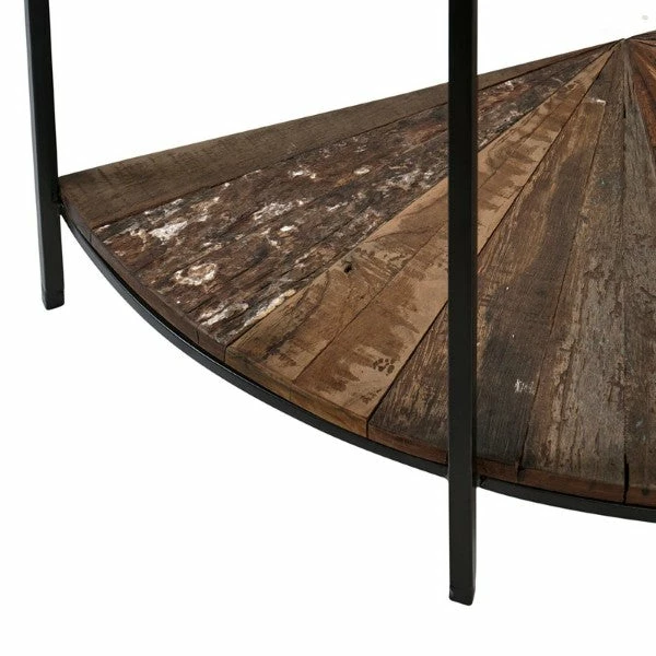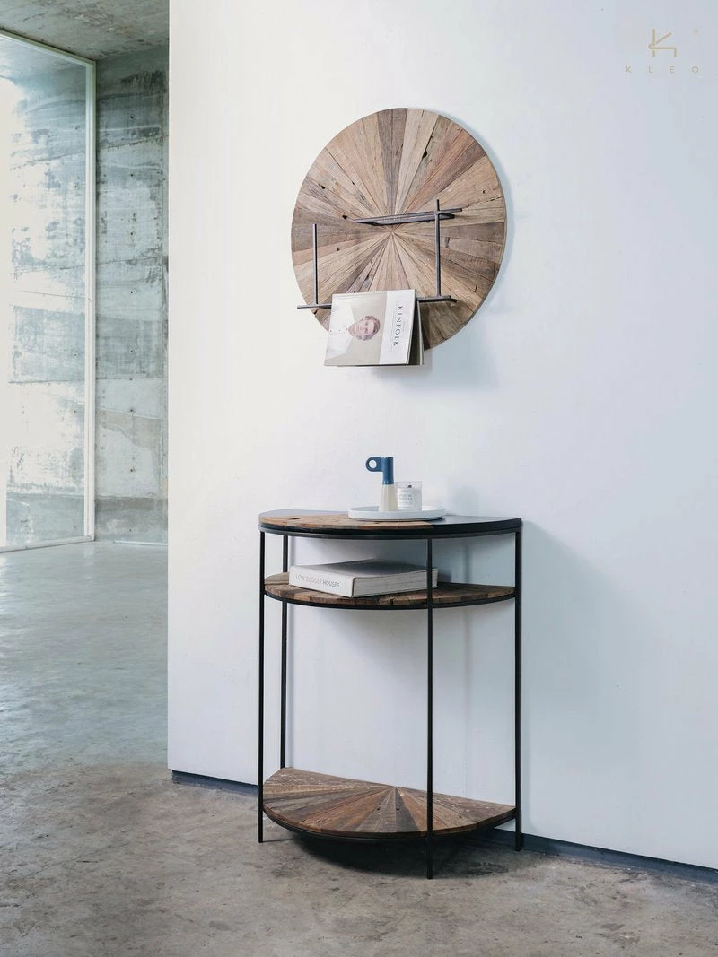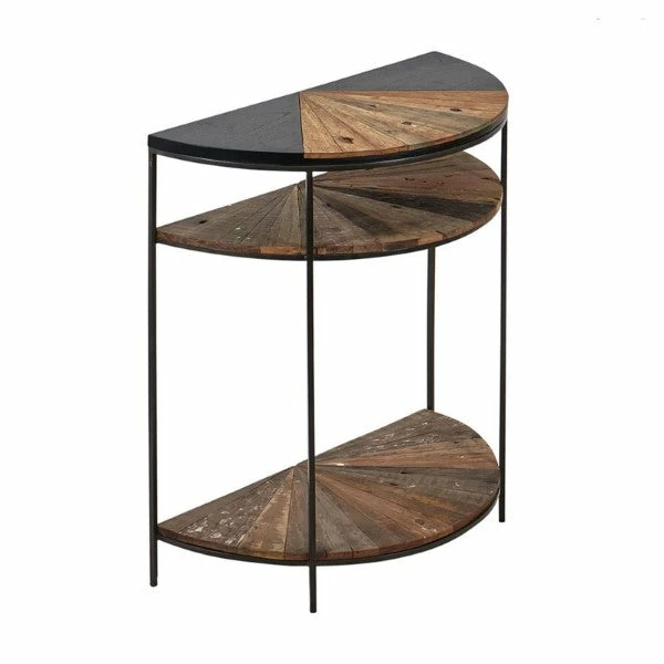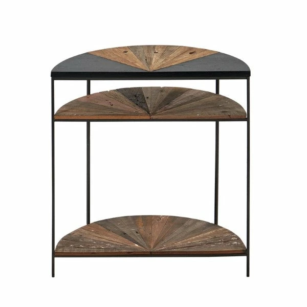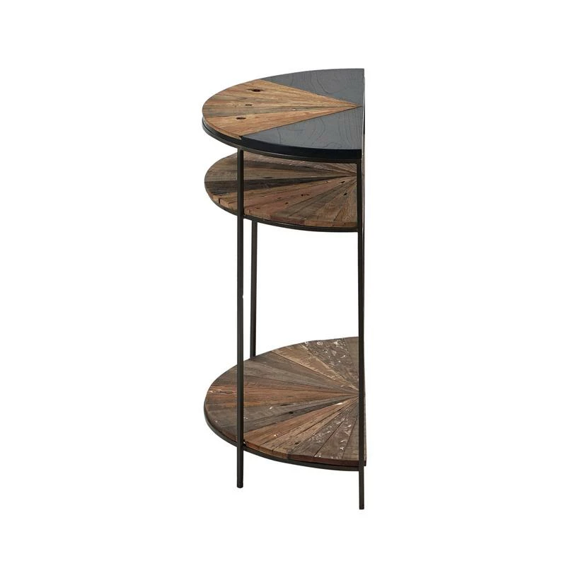 The Sublime Console Table consists of three half-moon shelf tiers in a geometric fan pattern. It is made from powder-coated iron in a mottled metallic colour finish, Mindi wood in a satin black finish and reclaimed mixed hardwood sourced from decommissioned fishing boats from North Java.
