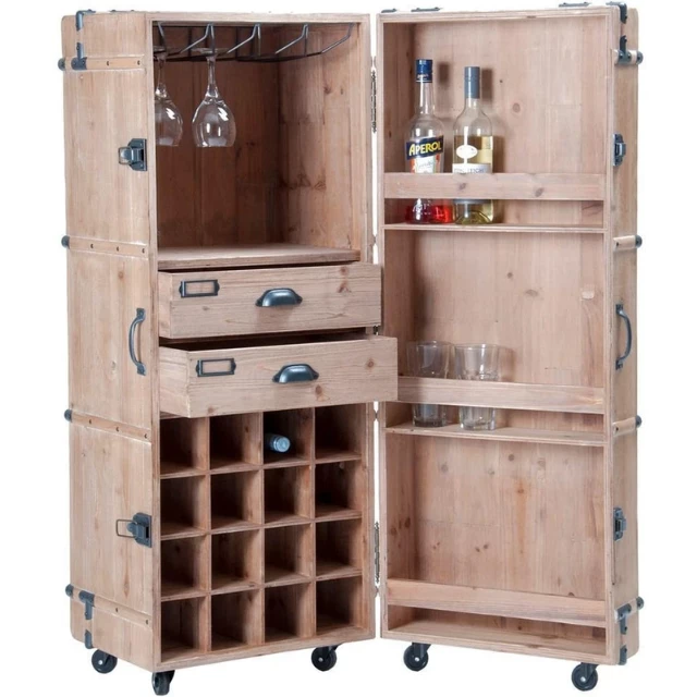 Two Tone Mini Bar on castors is made from Pine wood and metal trim. Compact & moveable, it brings the drinks cabinet to you. There is storage for 16 bottles of wine, glass storage & mixers and spirits in the pull out door. Extra storage is in the 2 pull out drawers, it truly is the great entertainer